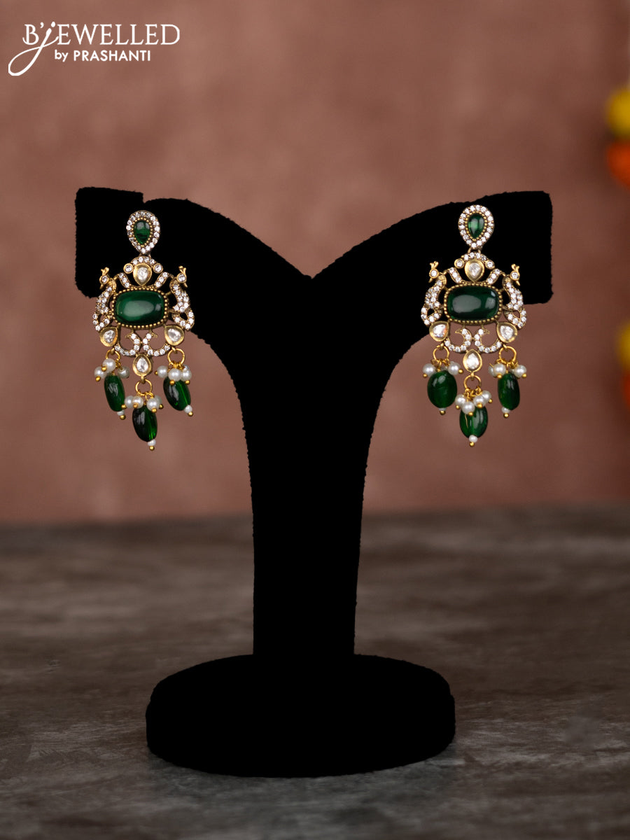 Beaded double layer green necklace with emerald kundan & cz stones and pearl hangings in victorian finish