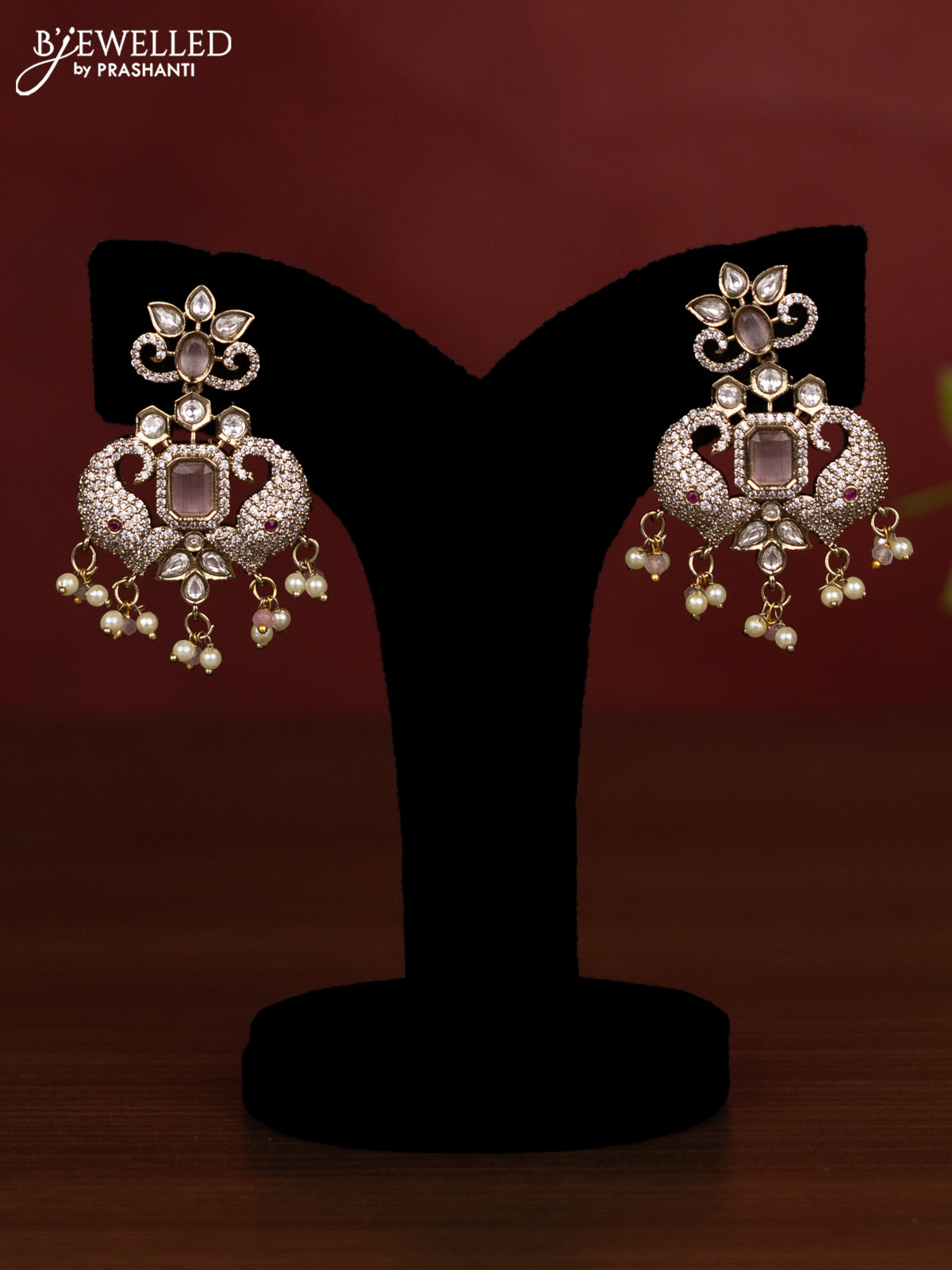 Beaded triple layer baby pink necklace with kundan & cz stones and pearl & beads hanging in victorian finish