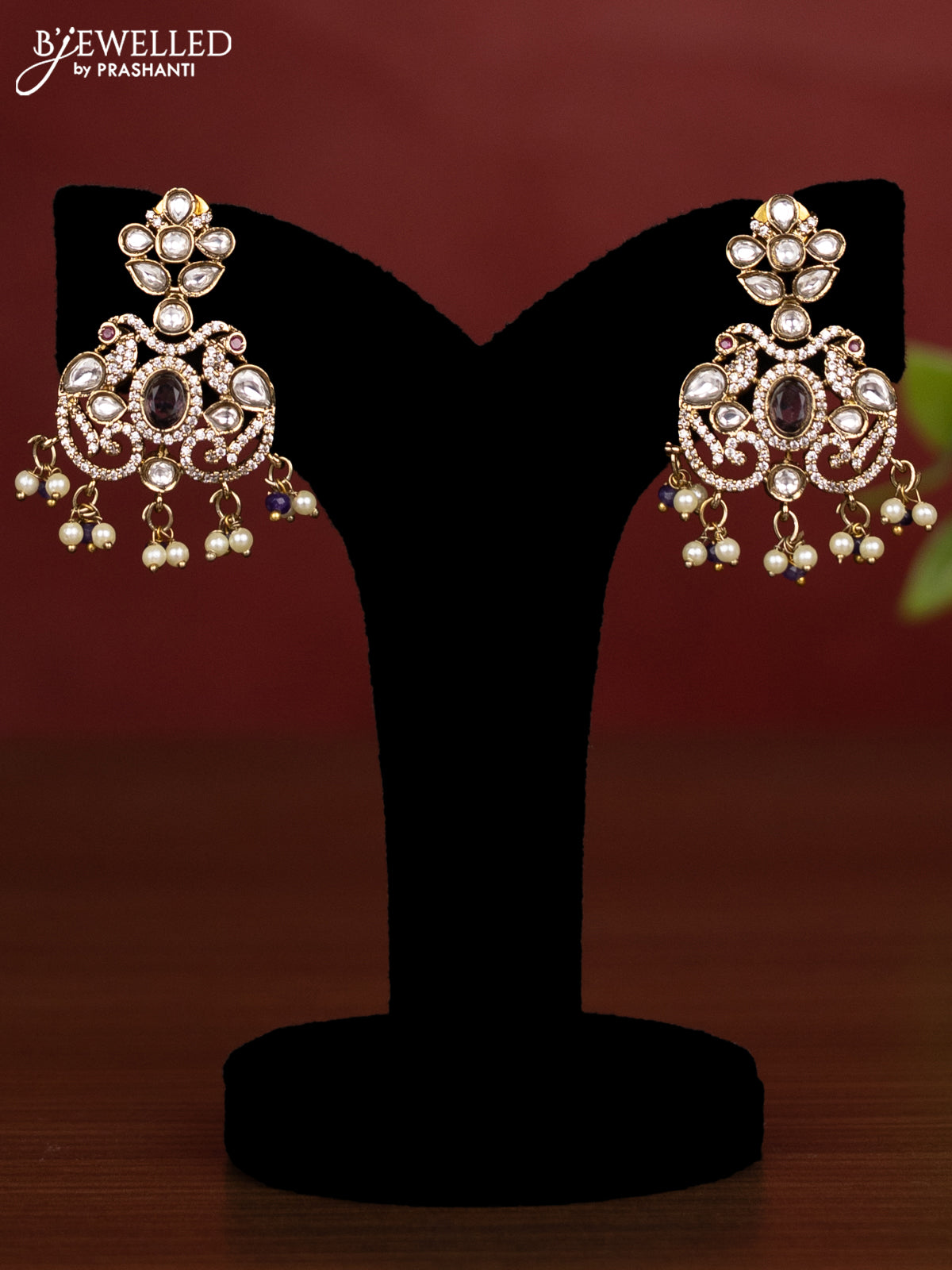 Beaded triple layer violet necklace peacock design with kundan & cz stones and pearl & beads hanging