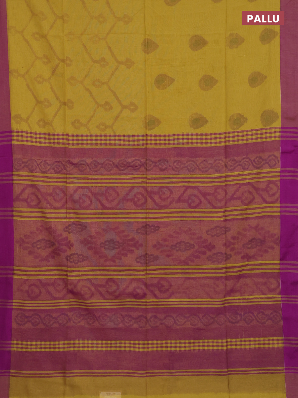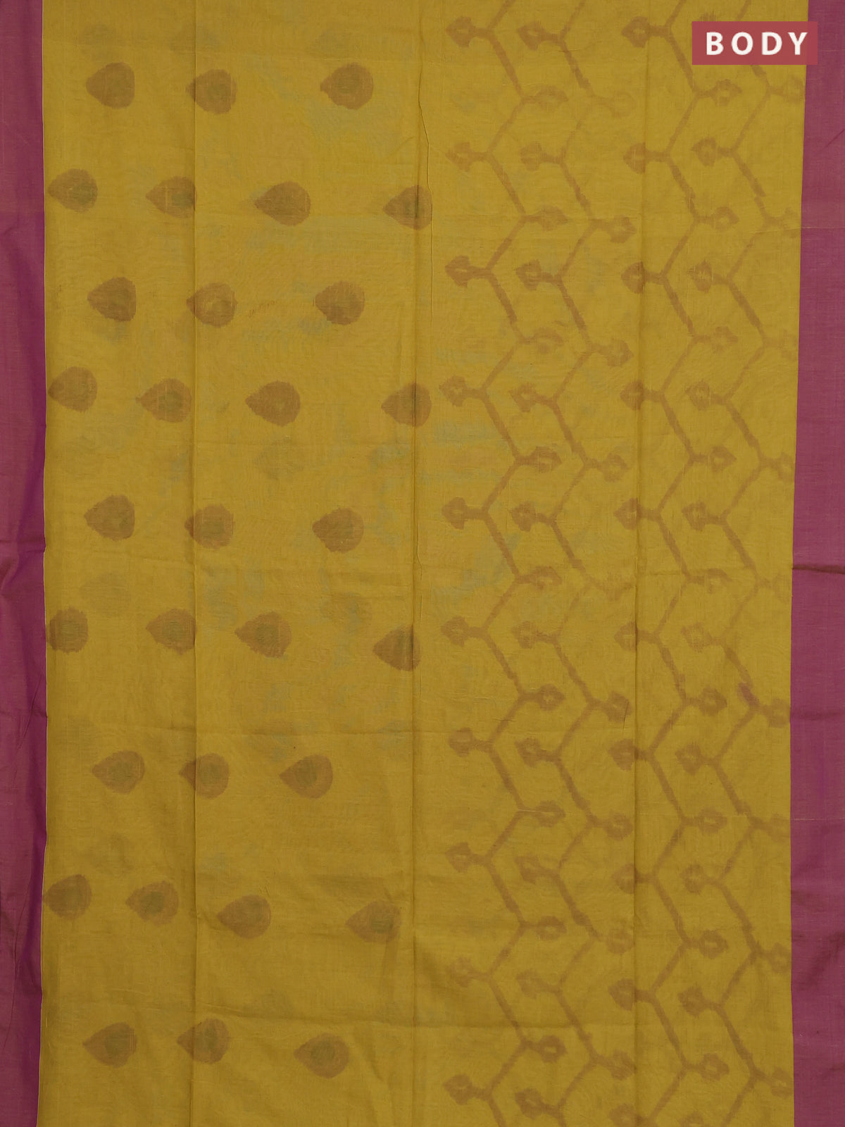 Bengal soft cotton saree mustard yellow and purple with allover butta weaves and simple border
