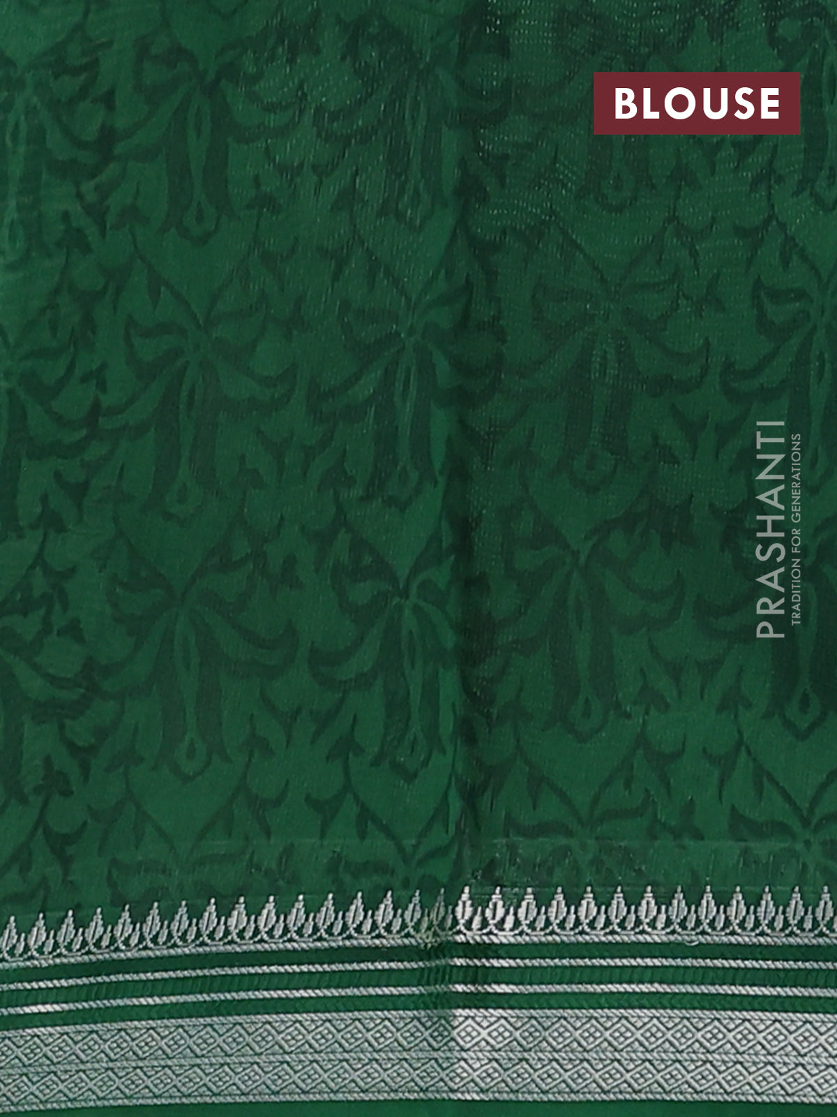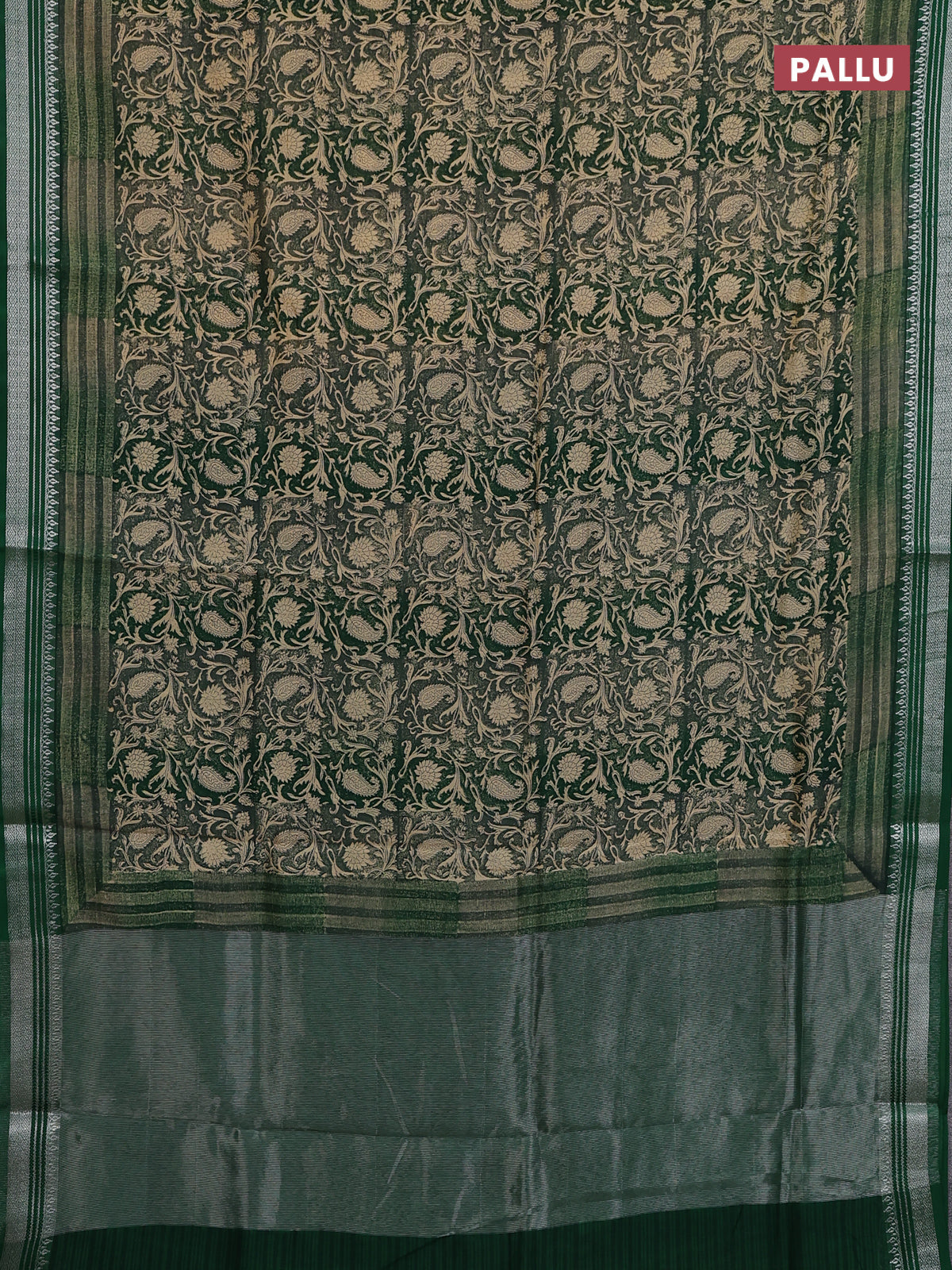 Chanderi silk cotton saree beige and bottle green with allover prints and silver zari woven border