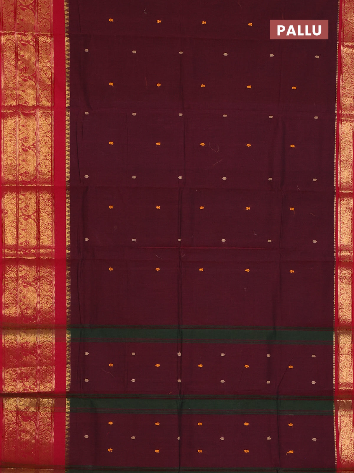 Chettinad cotton saree maroon and red with thread woven buttas and annam & elephant zari woven border
