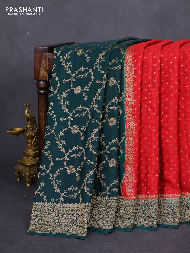 Banarasi crepe partly saree red and dark green with allover thread & zari woven butta weaves and woven border