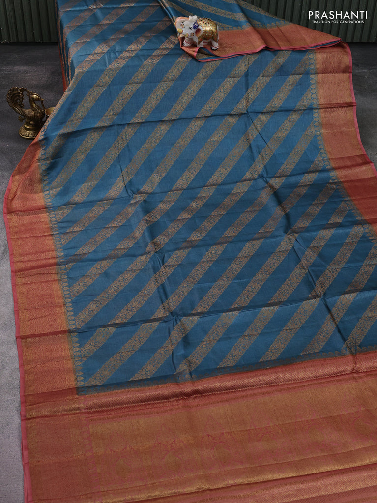 Banarasi tussar silk saree cs blue and rust shade with allover thread & zari woven buttas and woven border