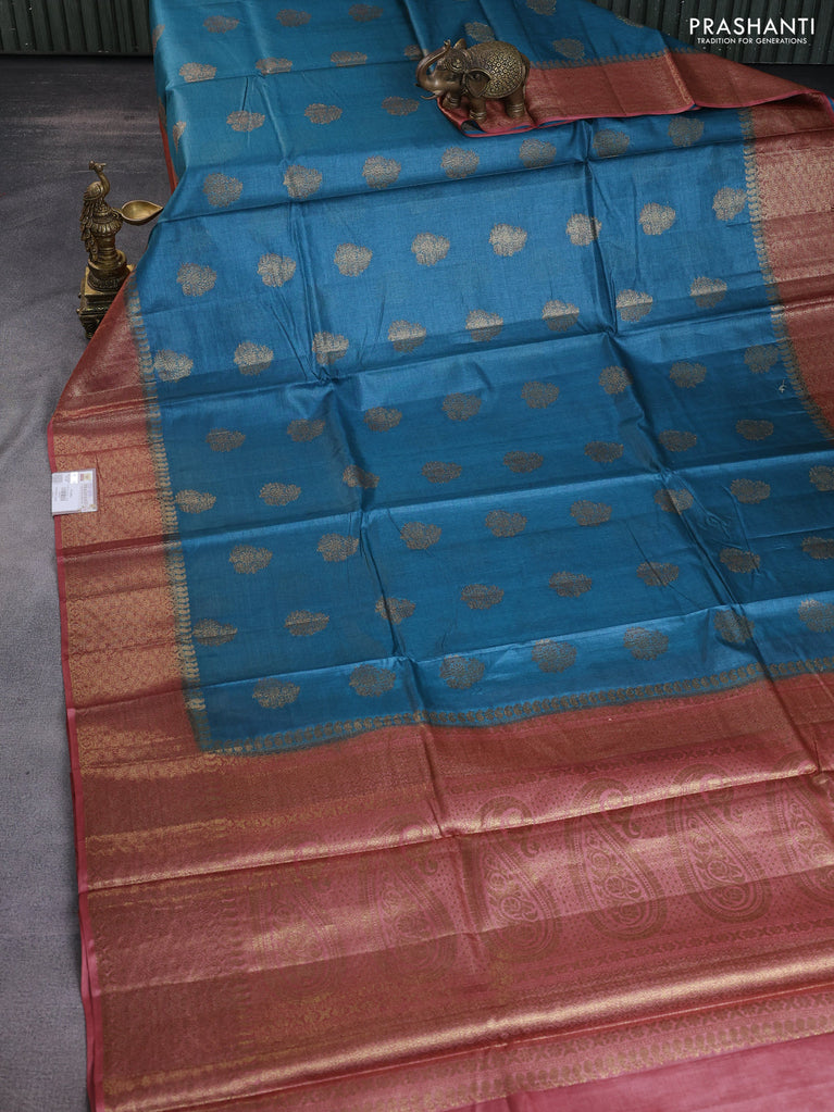 Banarasi tussar silk saree peacock blue and rust shade with thread & zari buttas and banarasi style border