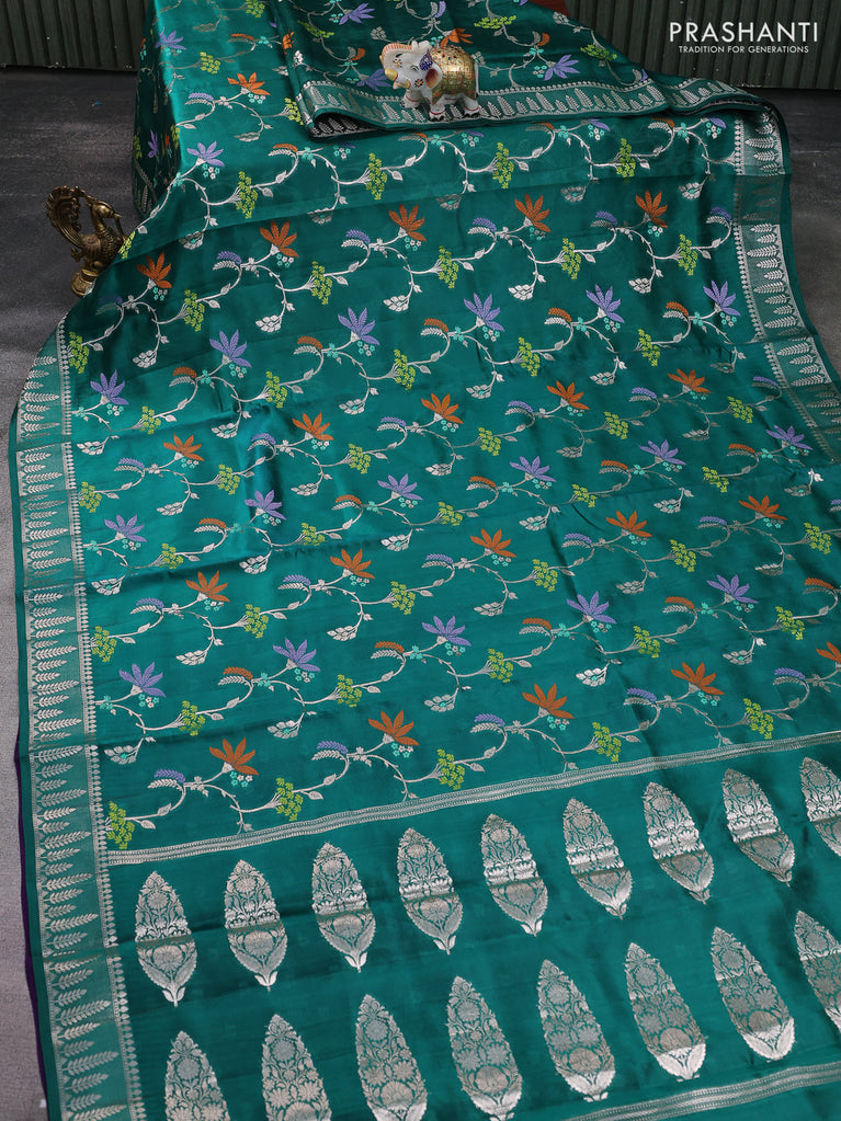 Banarasi poona silk saree teal green and violet with allover thread & silver zari weaves and silver zari woven border