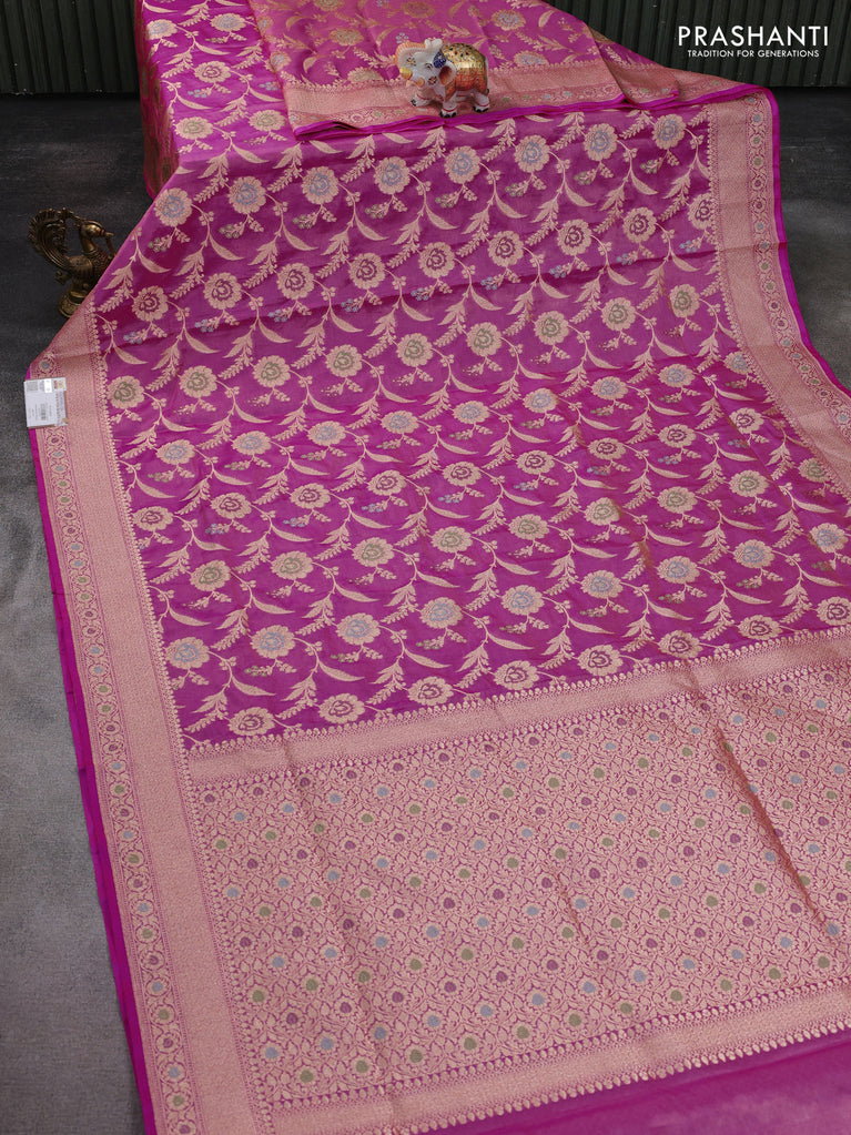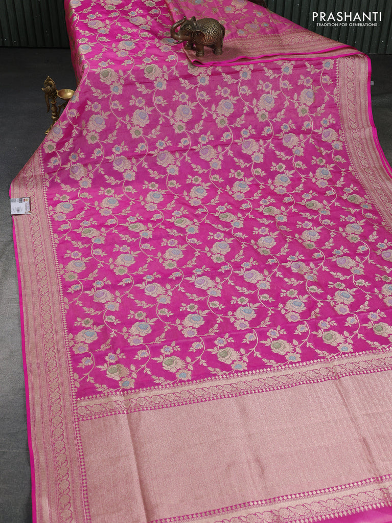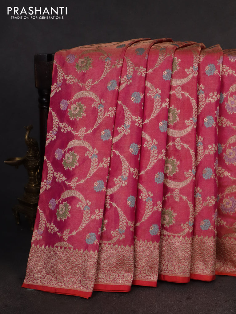 Banarasi tissue silk saree pink with allover floral zari woven brocade weaves and zari woven border