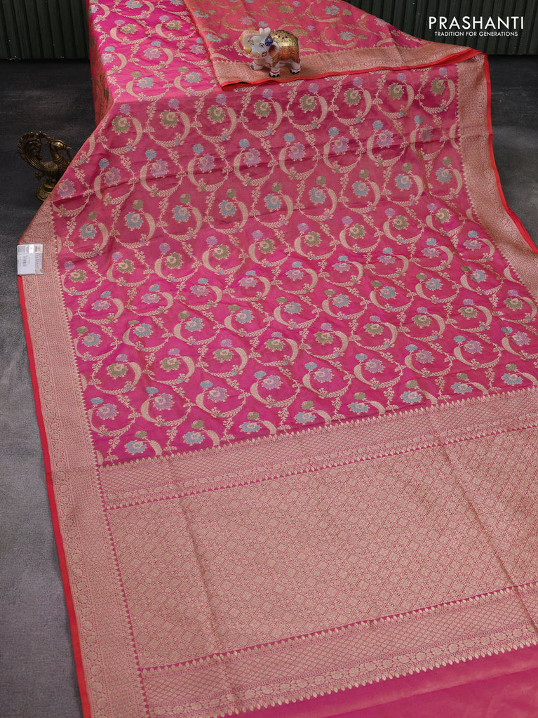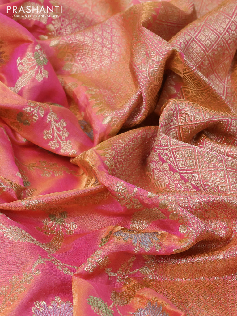 Banarasi tissue silk saree pink and dual shade of pinkish orange with allover zari woven brocade weaves and zari woven border