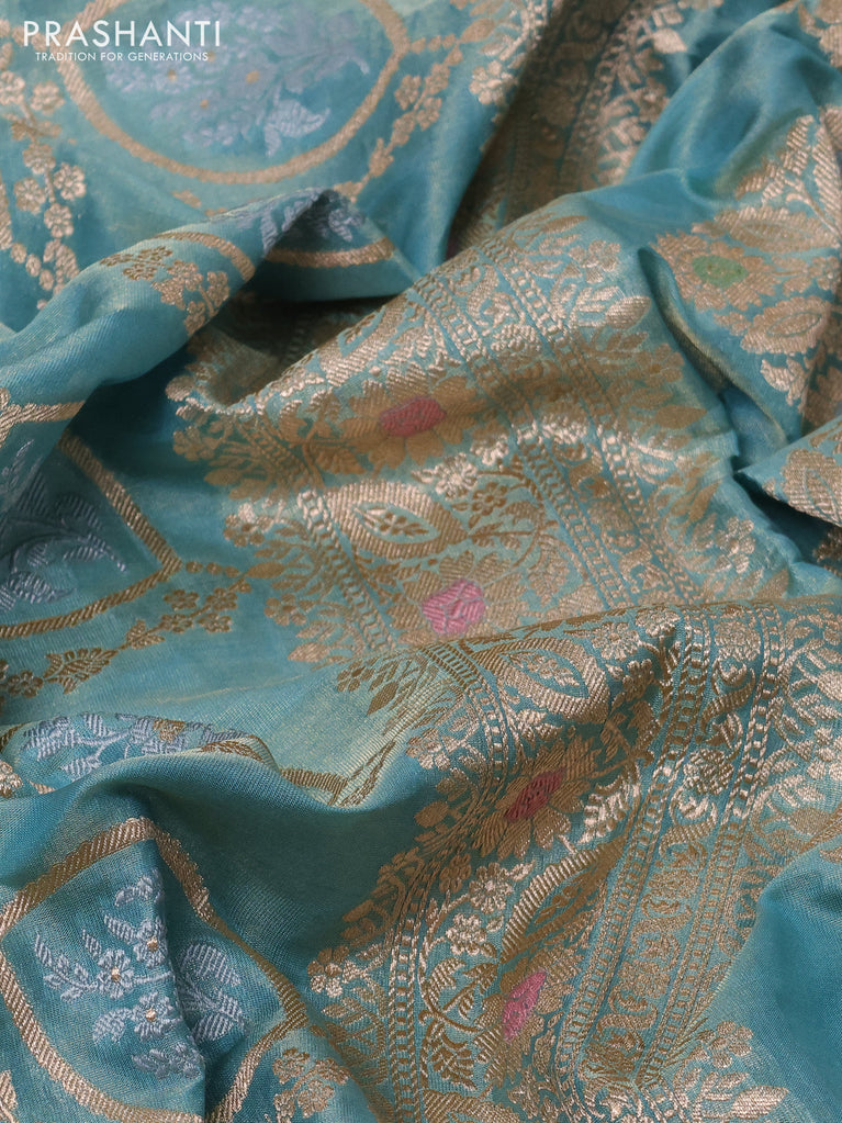 Banarasi tissue silk saree teal blue with allover zari woven brocade weaves and zari woven border