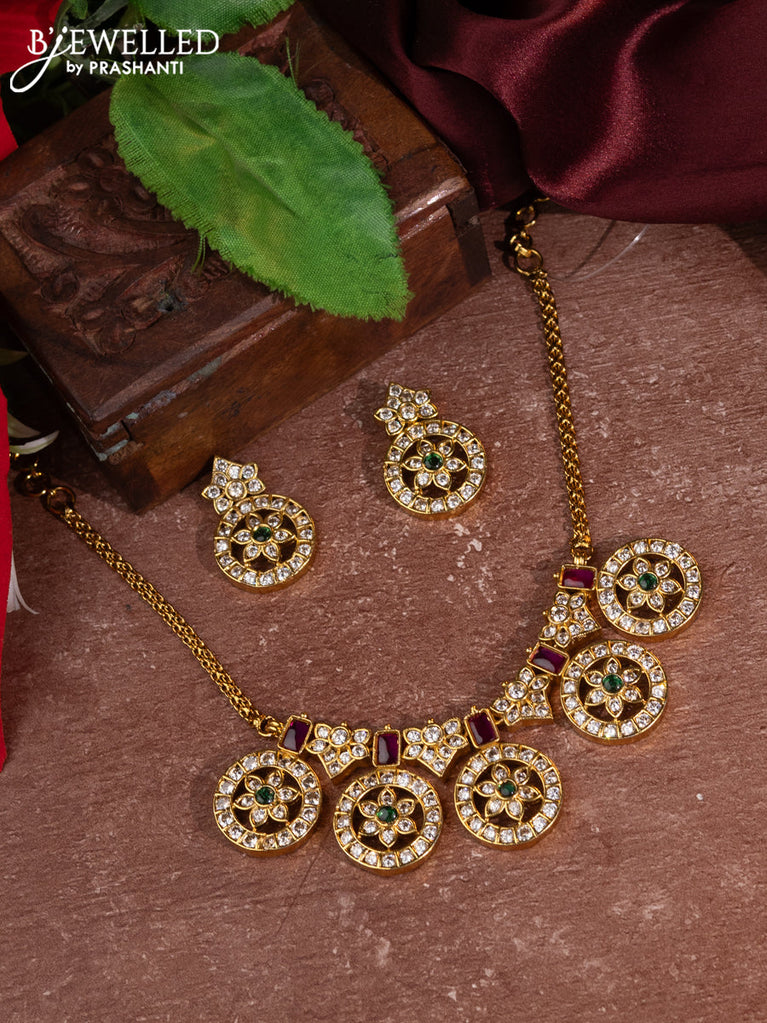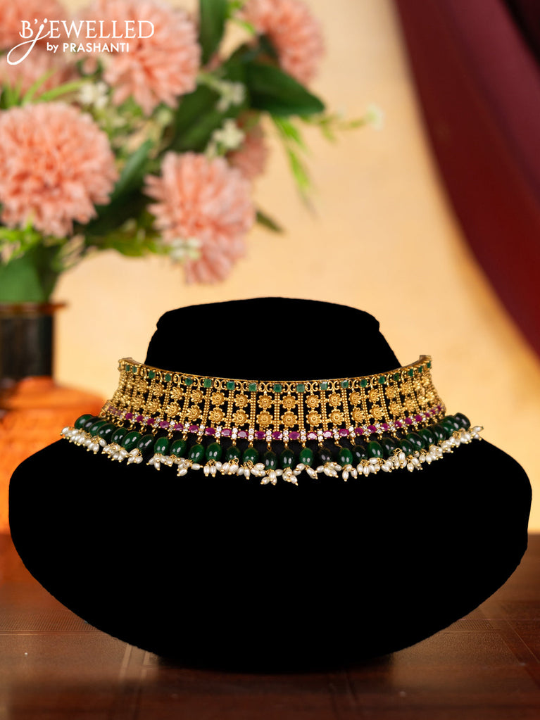 Antique choker floral design with kemp & cz stones and pearl & green beads hangings without earrings