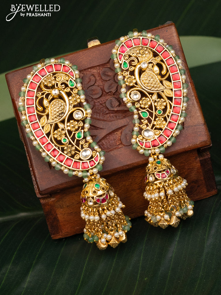 Antique earcuff jhumka with kemp pachi kundan stones and pearl & green beads hanging