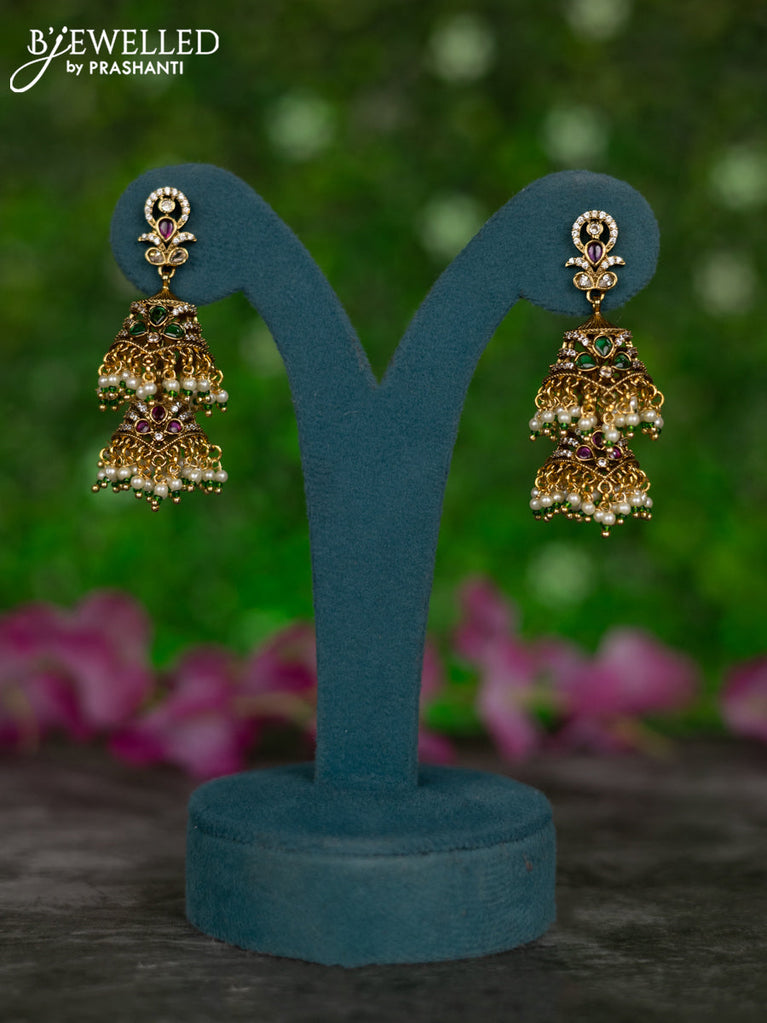 Antique double layer jhumkas with kemp & cz stones and pearl hangings