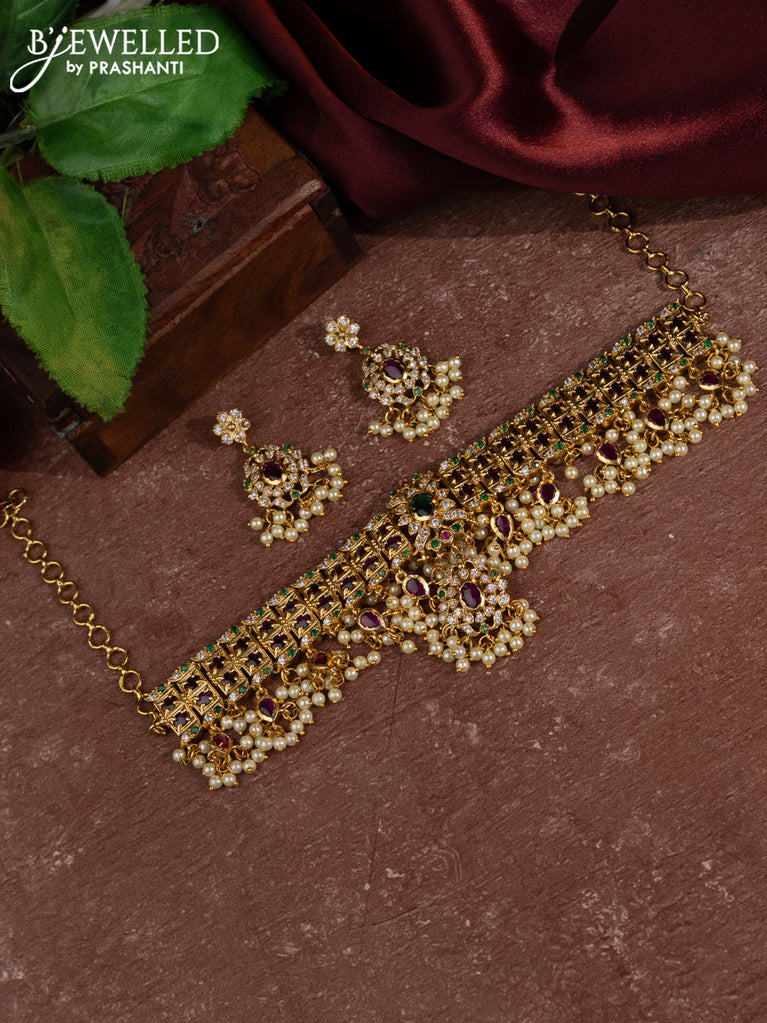 Antique choker with kemp & cz stones and pearl & golden beads hangings