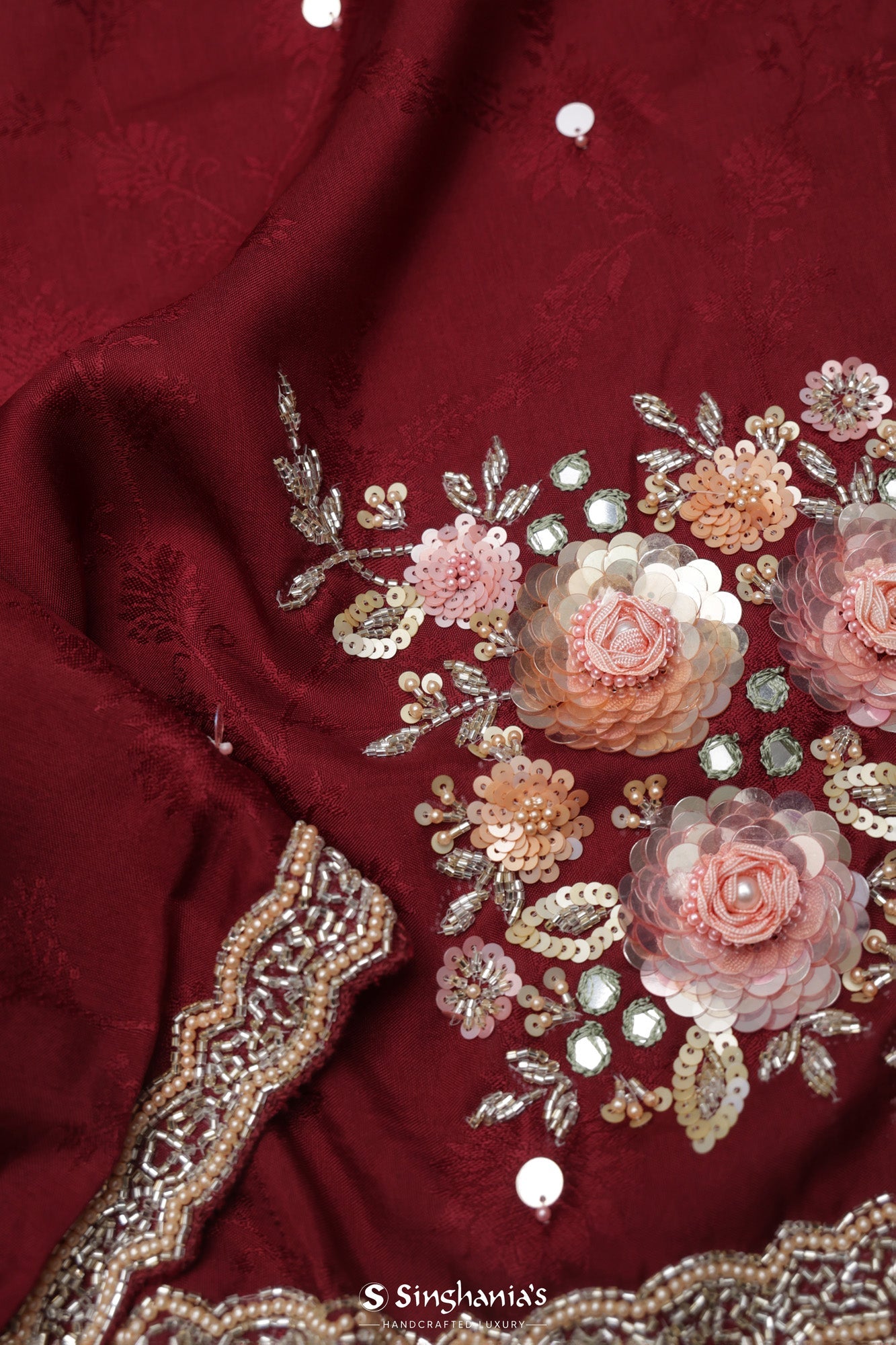 Embrace elegance with this handcrafted Modal Satin saree in Crimson Maroon. Suitable for festive wear, office wear, or weddings, the saree features floral buttis and a small floral border, adding a touch of grace to your attire.