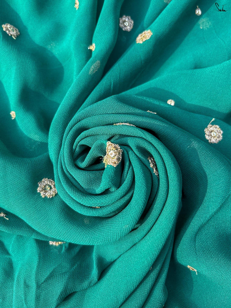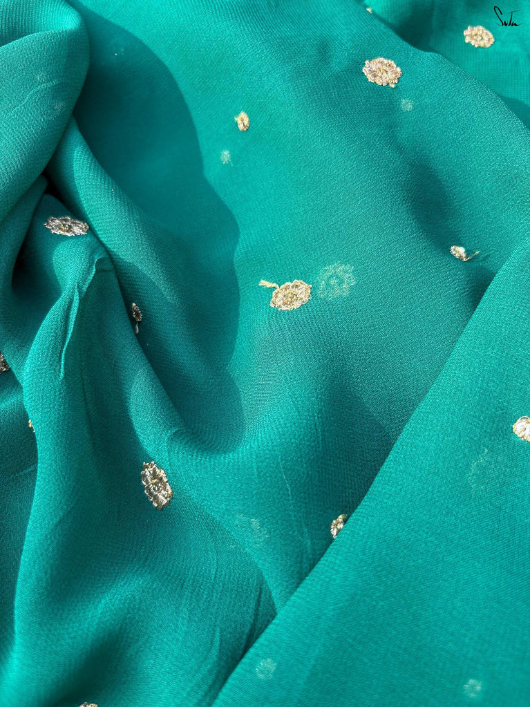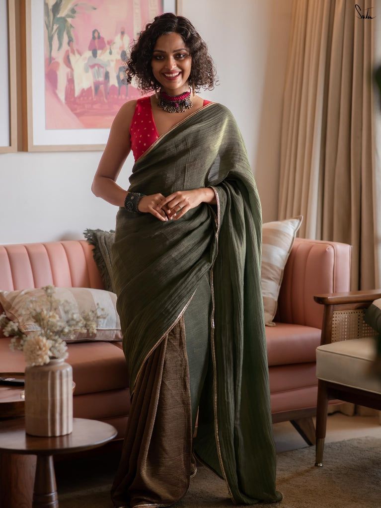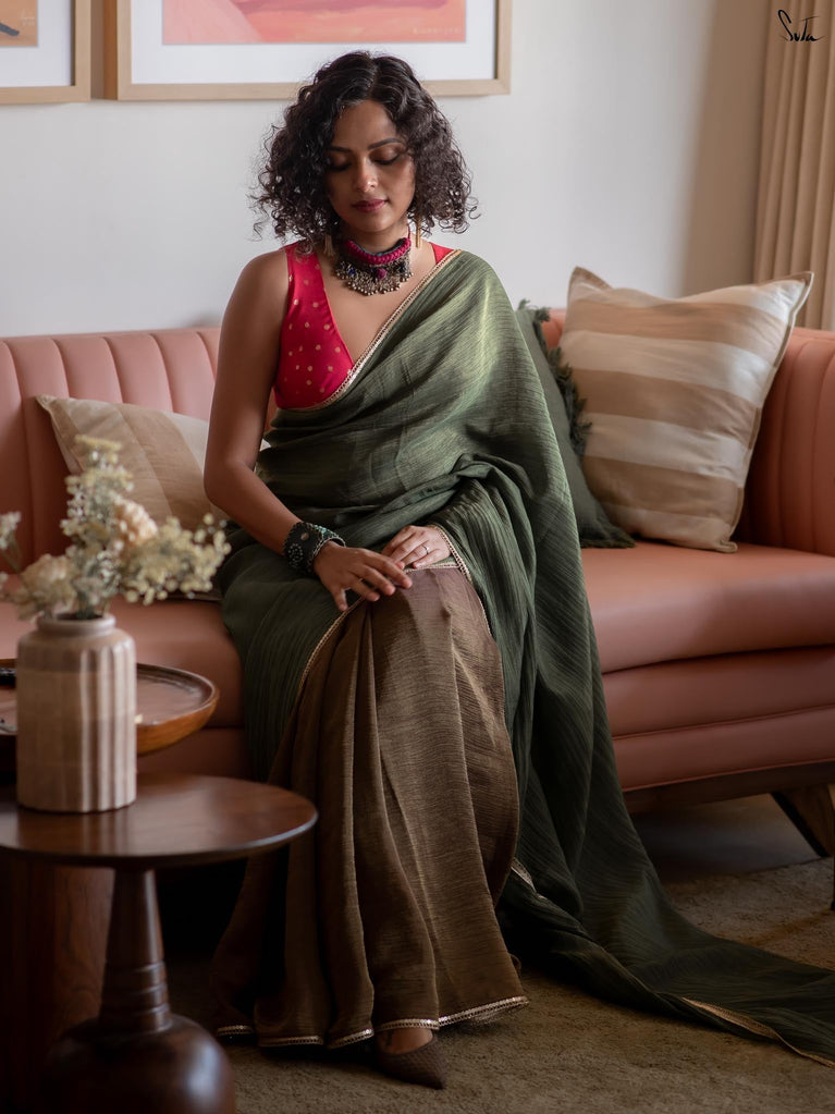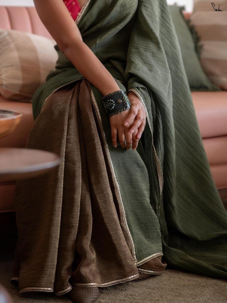 When colours meet with intention, they create their own kind of magic.This crushed viscose zari saree pairs the richness of green with the depth of black, forming a striking contrast that feels bold yet timeless. The crushed texture of the viscose gives the saree a naturally fluid drape, while the decorative gold lace along the borders adds a touch of delicate shimmer.