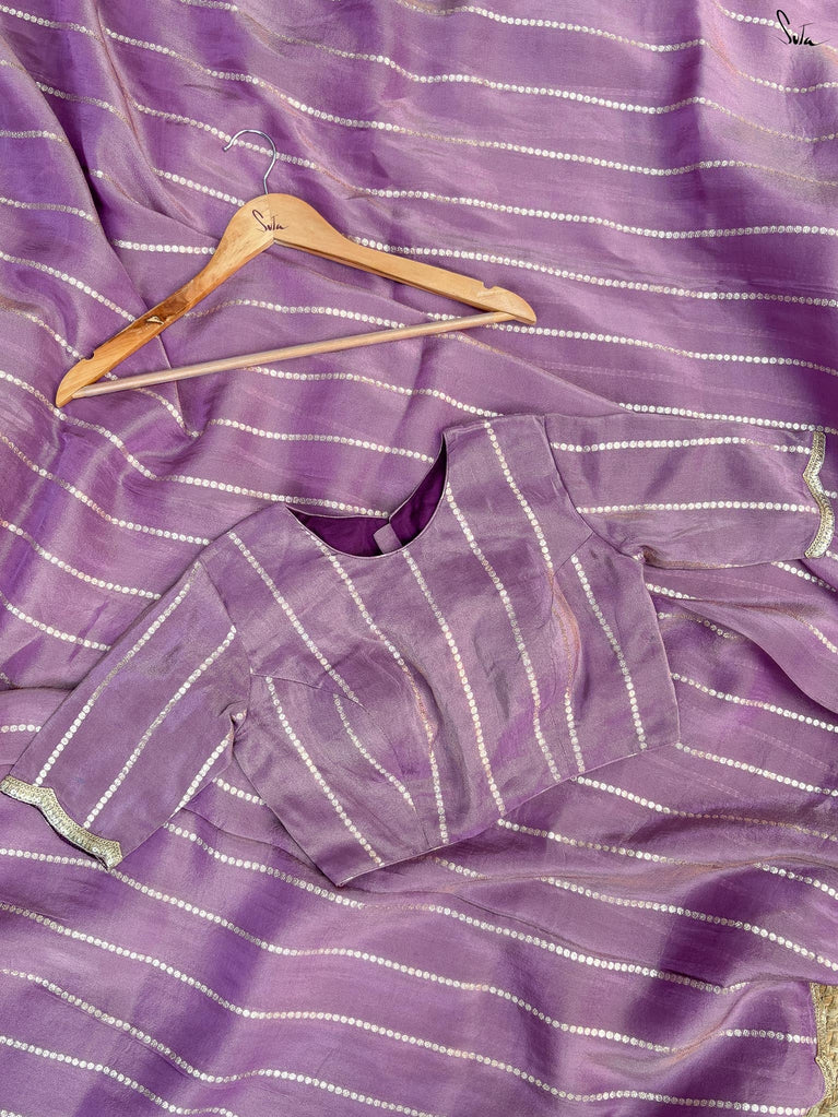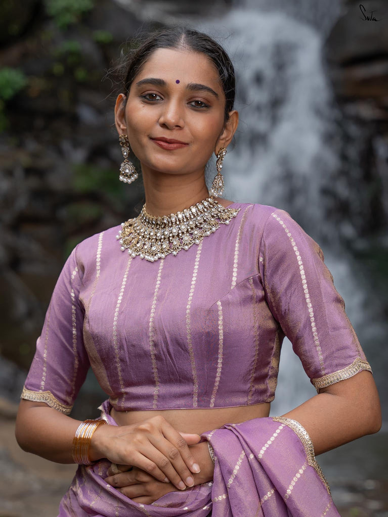 This blouse is made for creative styling possibilities. The lavender shade radiates serene confidence and subtle allure. Viscose zari shimmers with a soft, ethereal glow. Zari stripes add gentle movement and light. Scalloped lace embroidery traces every edge with intricate finesse. The close-neck front frames the collar with grace. Half sleeves with scallop detailing lend delicate charm. Padded structure and back hook ensure a perfect fit.