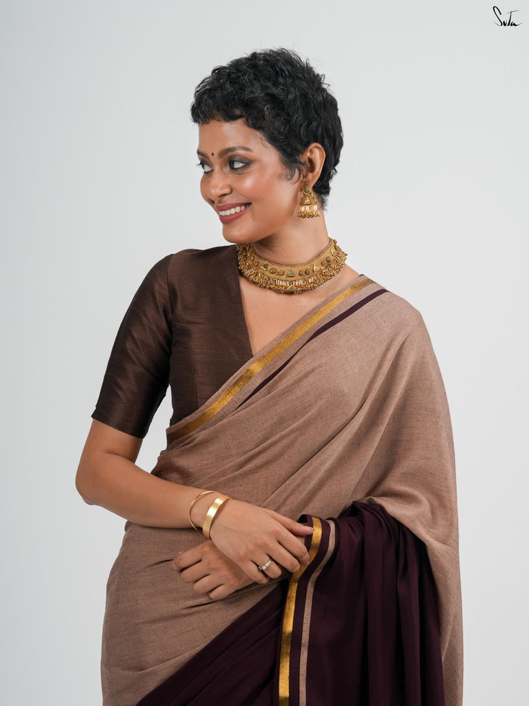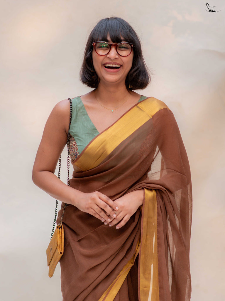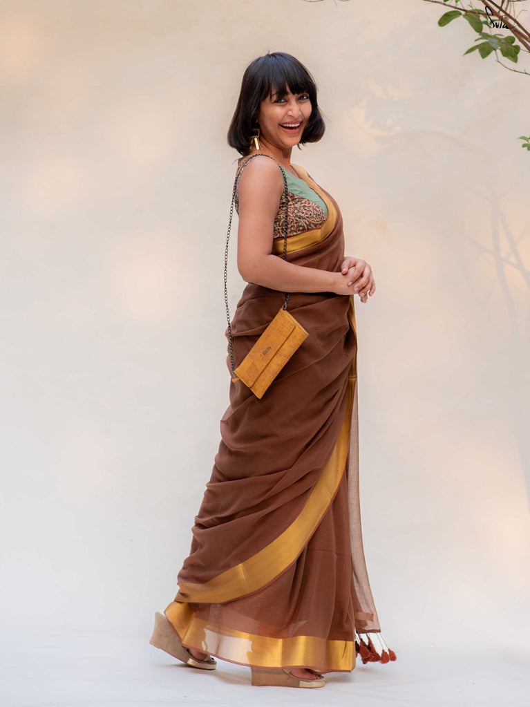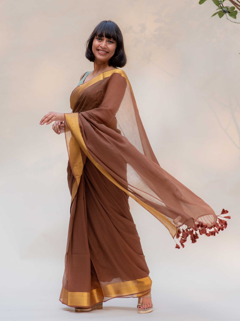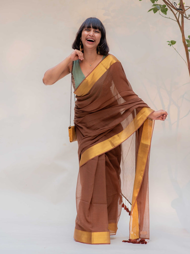 Warm, grounded, and quietly elegant - Clove Phool is summer cotton in a deeper, richer tone. Crafted in airy mul cotton, this brown saree drapes softly and feels feather-light on the skin. A classic gold zari border adds just enough glow, keeping the look timeless and easy.It’s the kind of saree you reach for on long days, slow evenings, and everything in between - effortless, breathable, and endlessly wearable.