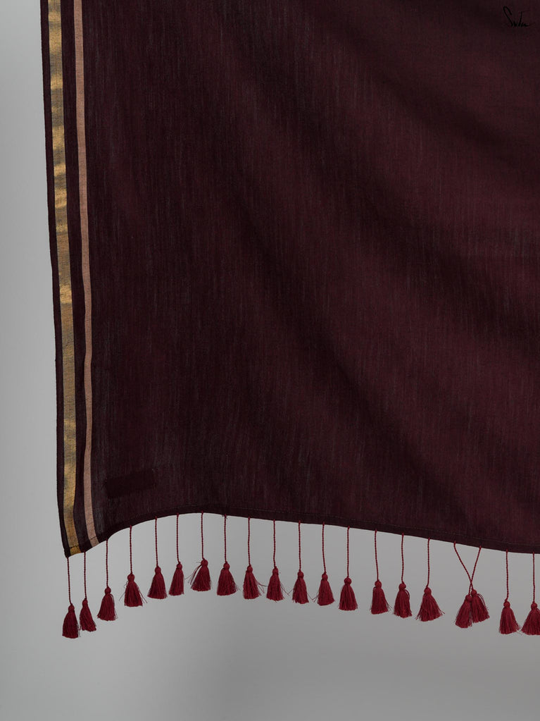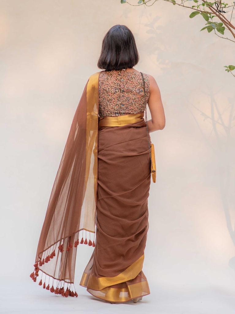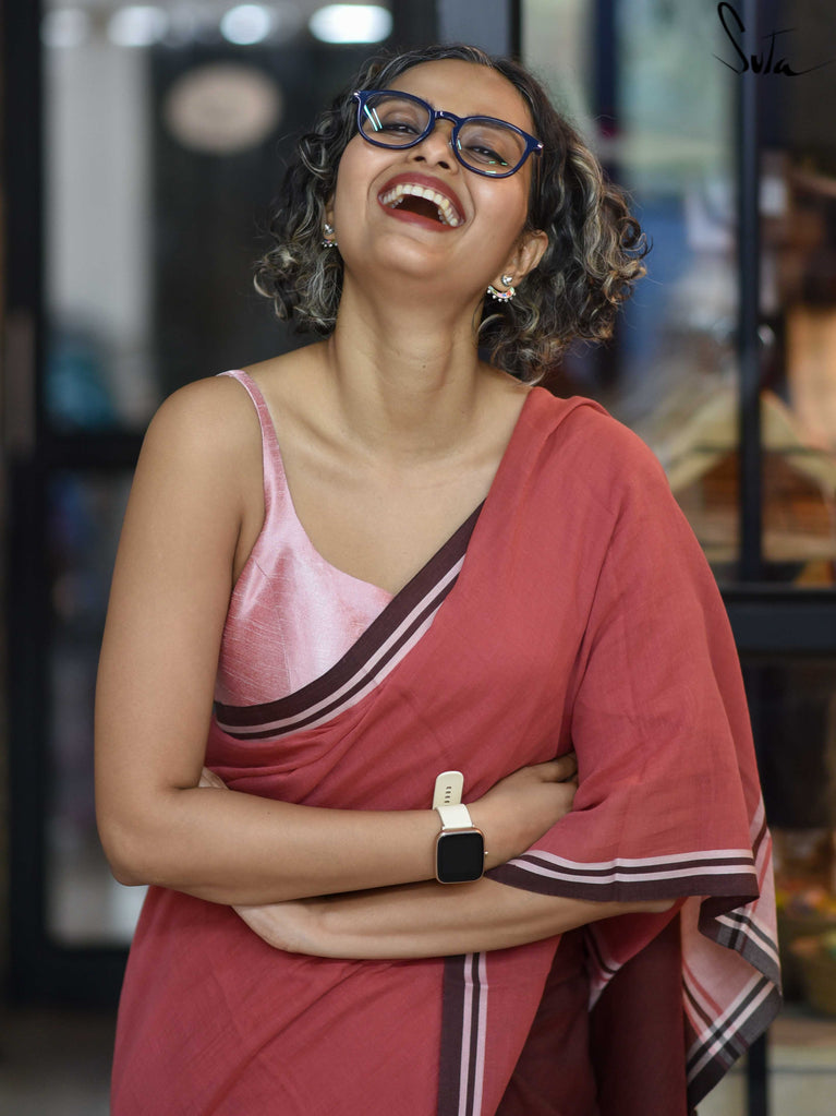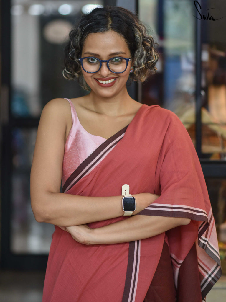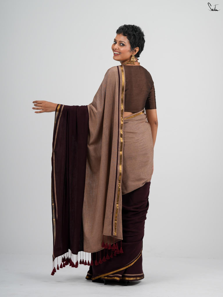 Warm, grounded, and quietly elegant - Clove Phool is summer cotton in a deeper, richer tone. Crafted in airy mul cotton, this brown saree drapes softly and feels feather-light on the skin. A classic gold zari border adds just enough glow, keeping the look timeless and easy.It’s the kind of saree you reach for on long days, slow evenings, and everything in between - effortless, breathable, and endlessly wearable.
