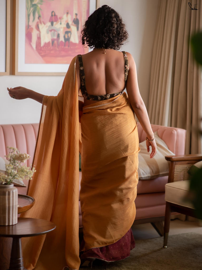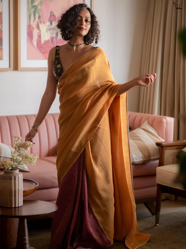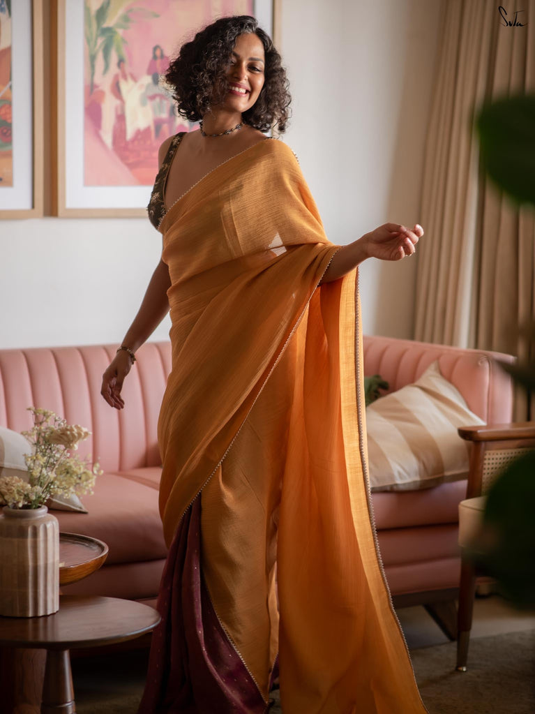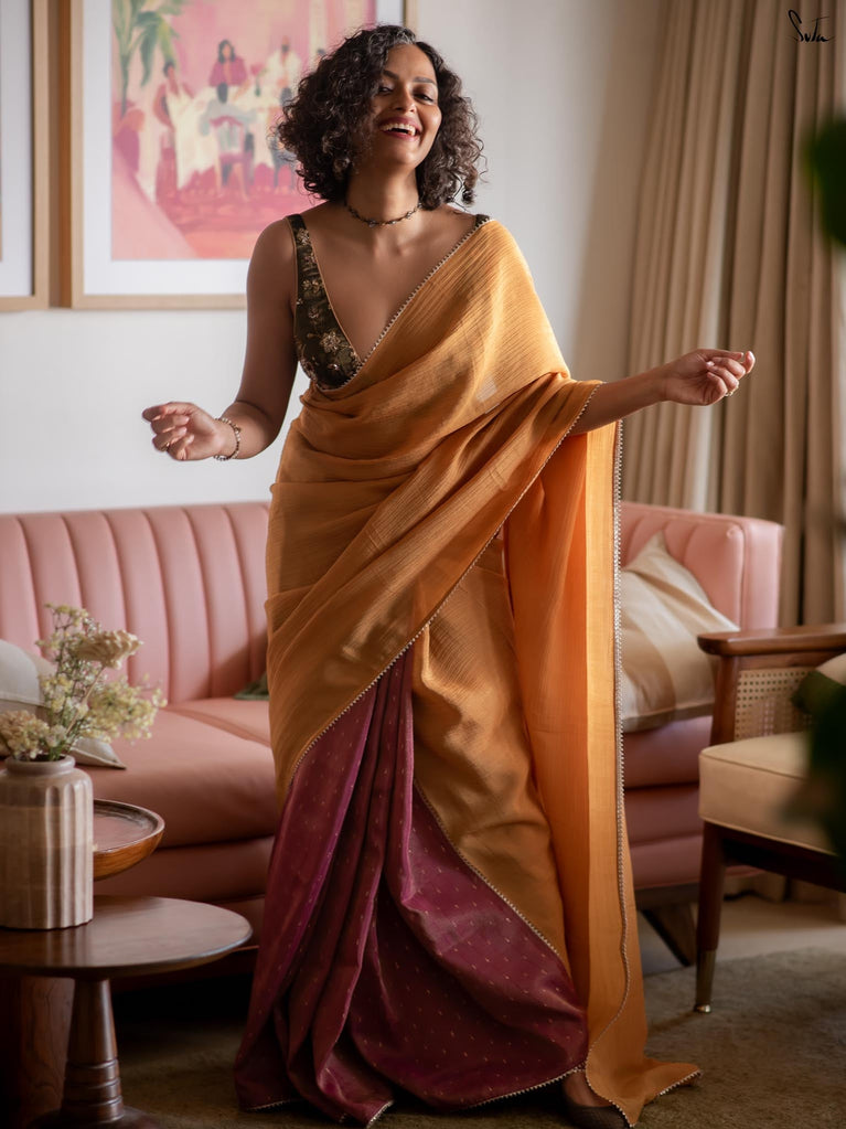 Two colours meet like melodies in conversation. This crushed viscose zari saree brings together the warmth of mustard and the depth of purple, creating a striking contrast that feels both bold and harmonious. The textured crush of the viscose lends the drape an effortless fluidity, while delicate gold lace along the borders adds just the right hint of festive shimmer.