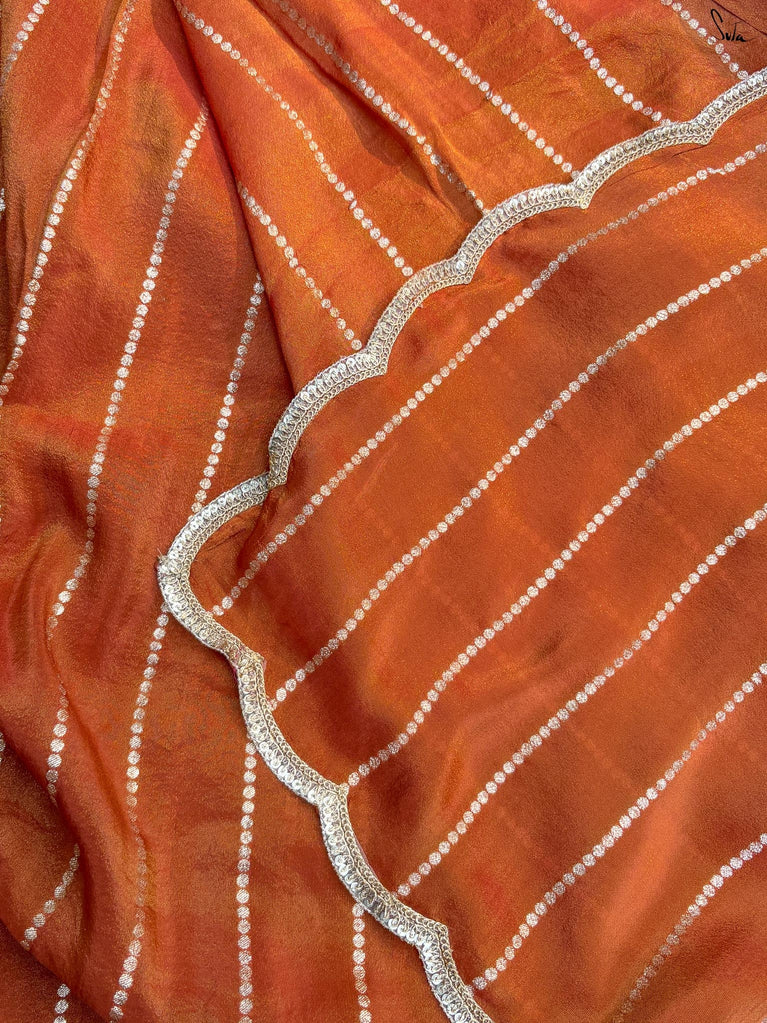 A saree that feels like sunrise caught in silk. The peach hue radiates warmth, wrapping you in a soft, flattering glow. Viscose zari lends it a molten gleam that moves with you. The zari stripes glint like light skimming over water. Embroidered scallop lace frames it with an air of effortless allure.