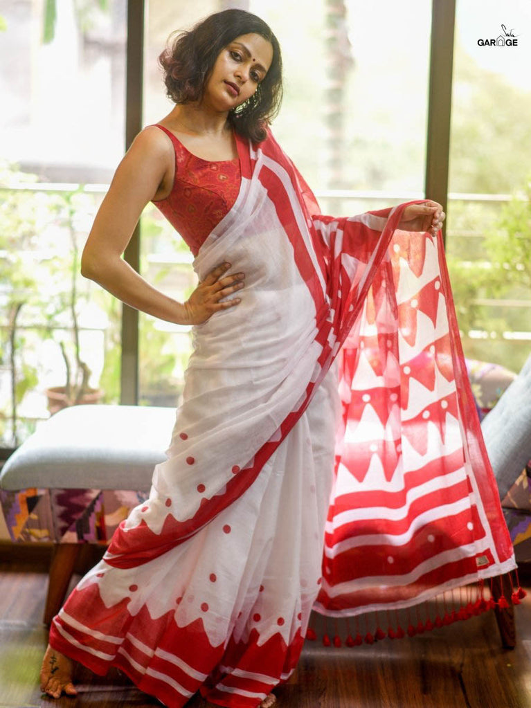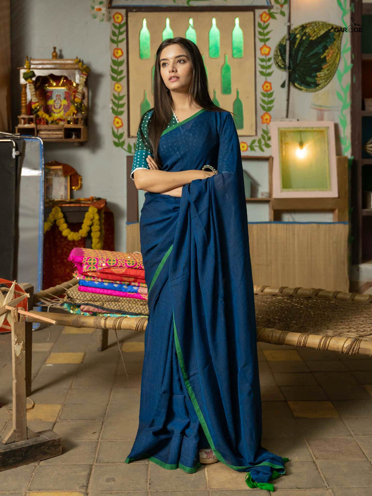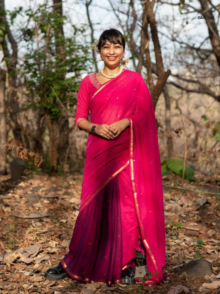 The model is wearing size S blouse and the saree is Main Line Rekha