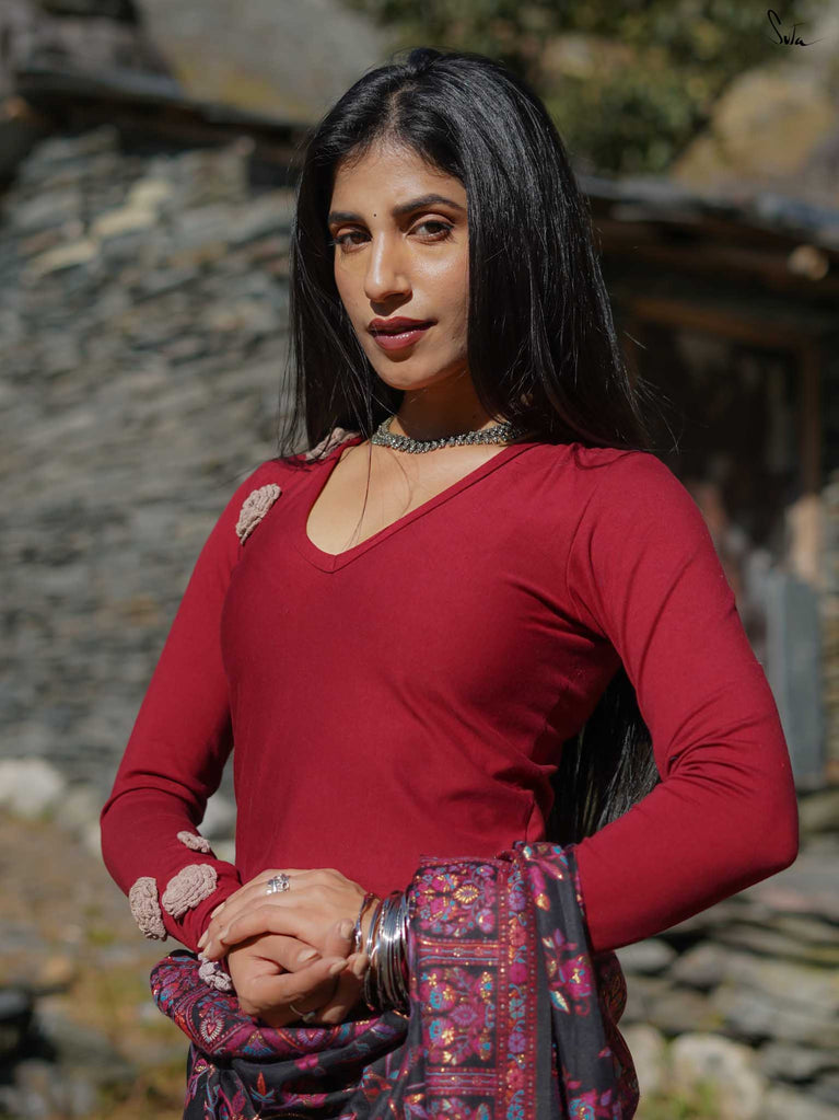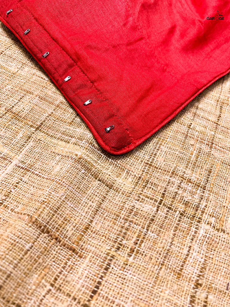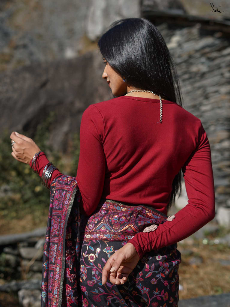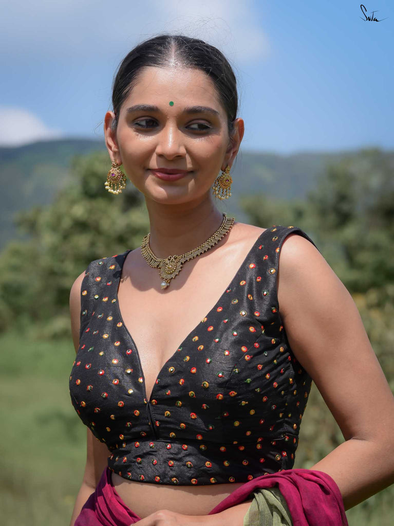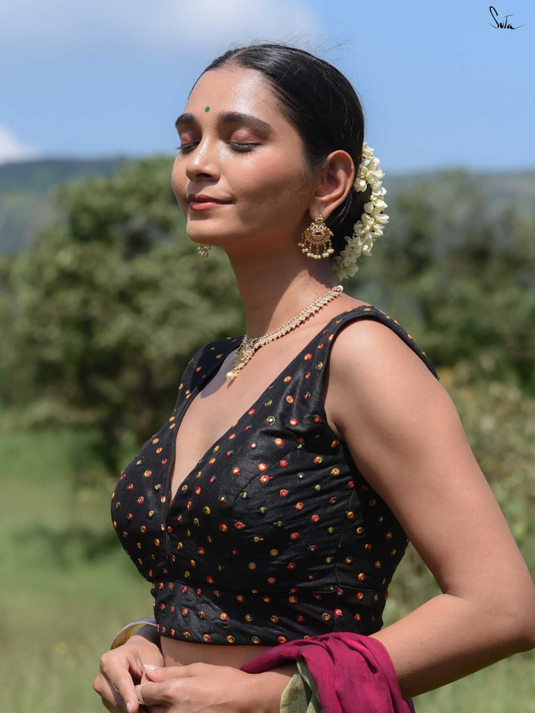 Named after Debjani’s endearing charm, this wine art silk blouse made by her is a must have. The dome neck and sleeveless cut flatter your shoulders, while the floral embroidered buttis add a delicate, artisanal touch. Padded and crafted with side elastic, it fits beautifully.