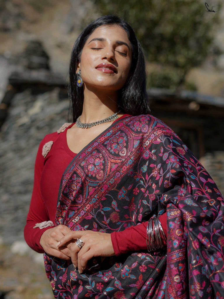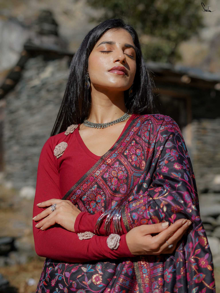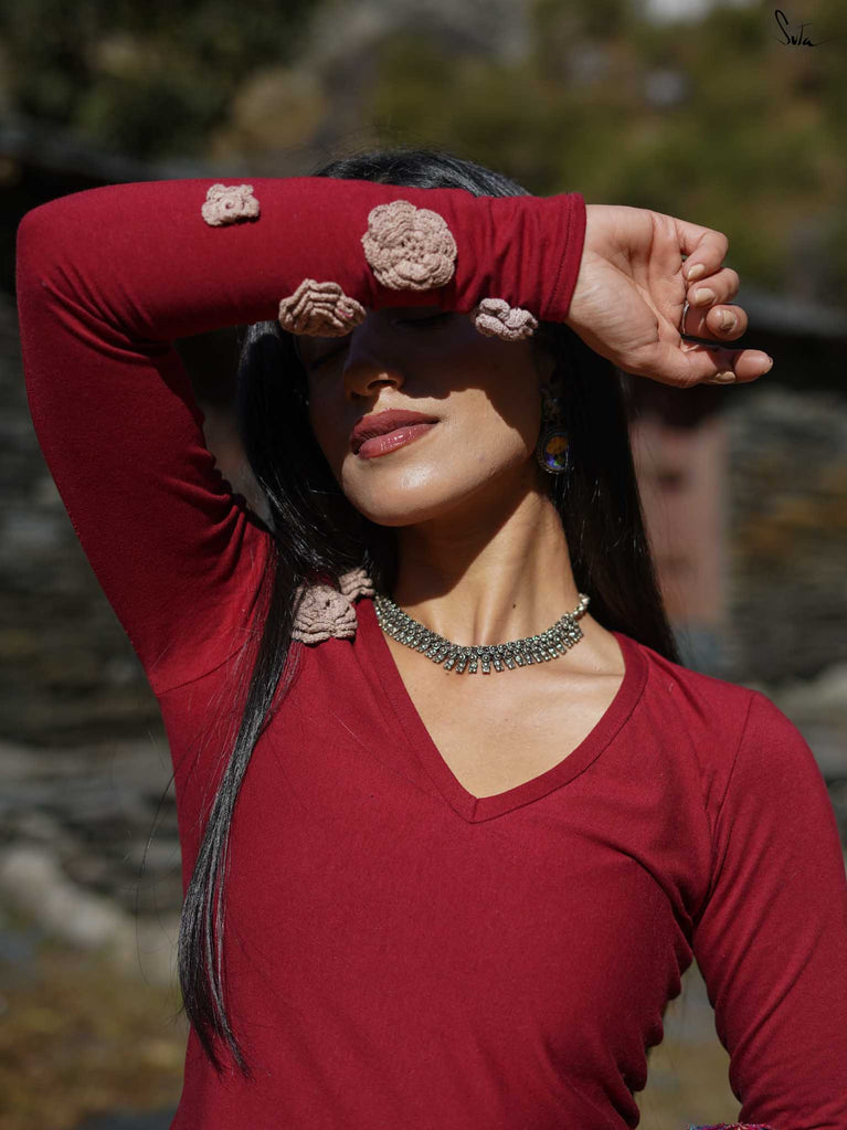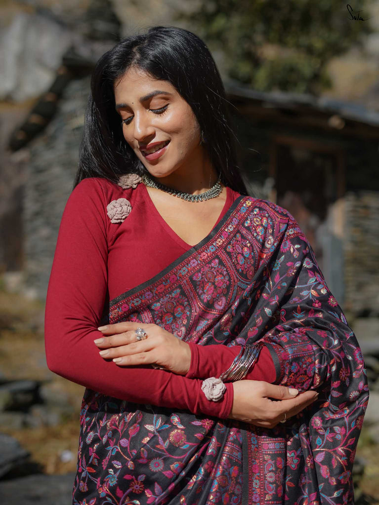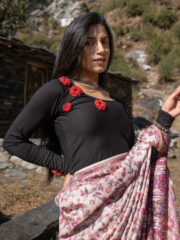 Named after Debjani’s endearing charm, this wine art silk blouse made by her is a must have. The dome neck and sleeveless cut flatter your shoulders, while the floral embroidered buttis add a delicate, artisanal touch. Padded and crafted with side elastic, it fits beautifully.