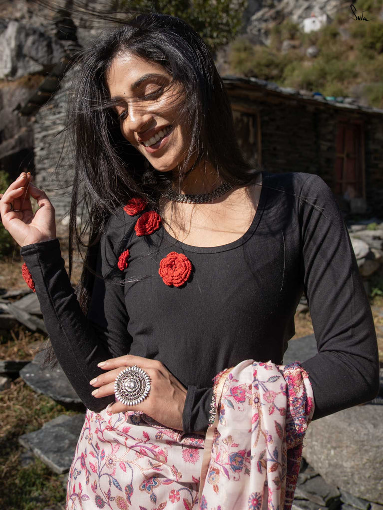 A blouse that blooms with beauty, this black sleeveless cotton piece is adorned with colorful embroidered flowers, capturing the lively spirit of Holi in every stitch. The Elas-Tech fit hugs your body perfectly, letting you move with ease and grace as you celebrate the colors of life. The elastic fabric stretches and molds to your shape, ensuring comfort and flexibility while you revel in the festivities. This blouse isn’t just a piece of clothing, it’s a moment, a memory, woven with floral joy. For the best fit, shop one size below, as the Elas-Tech expands and adapts to your body perfectly.