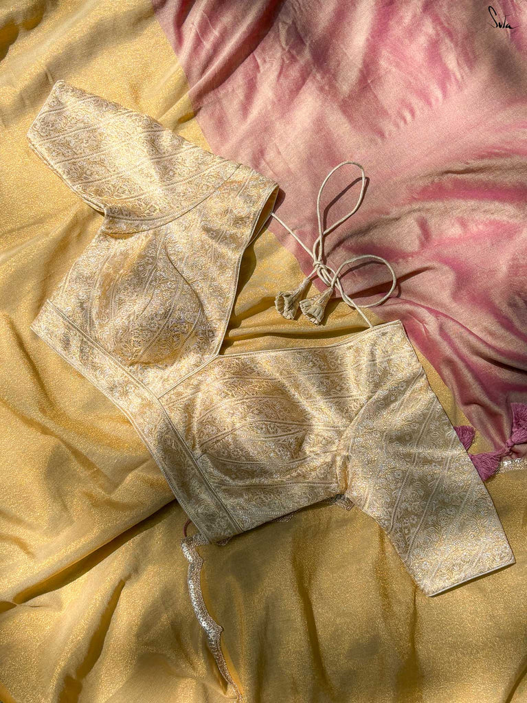 Shimmering, elegant, and festive, the Glitter Gold brings a radiant glow to any saree ensemble. Crafted with intricate machine zari floral embroidery, this sleeveless blouse features a flattering V-neckline and a back-open hook closure for a comfortable and stylish fit. Perfect for weddings, festive celebrations, or evening gatherings, it adds a touch of glamour and timeless charm to traditional attire.