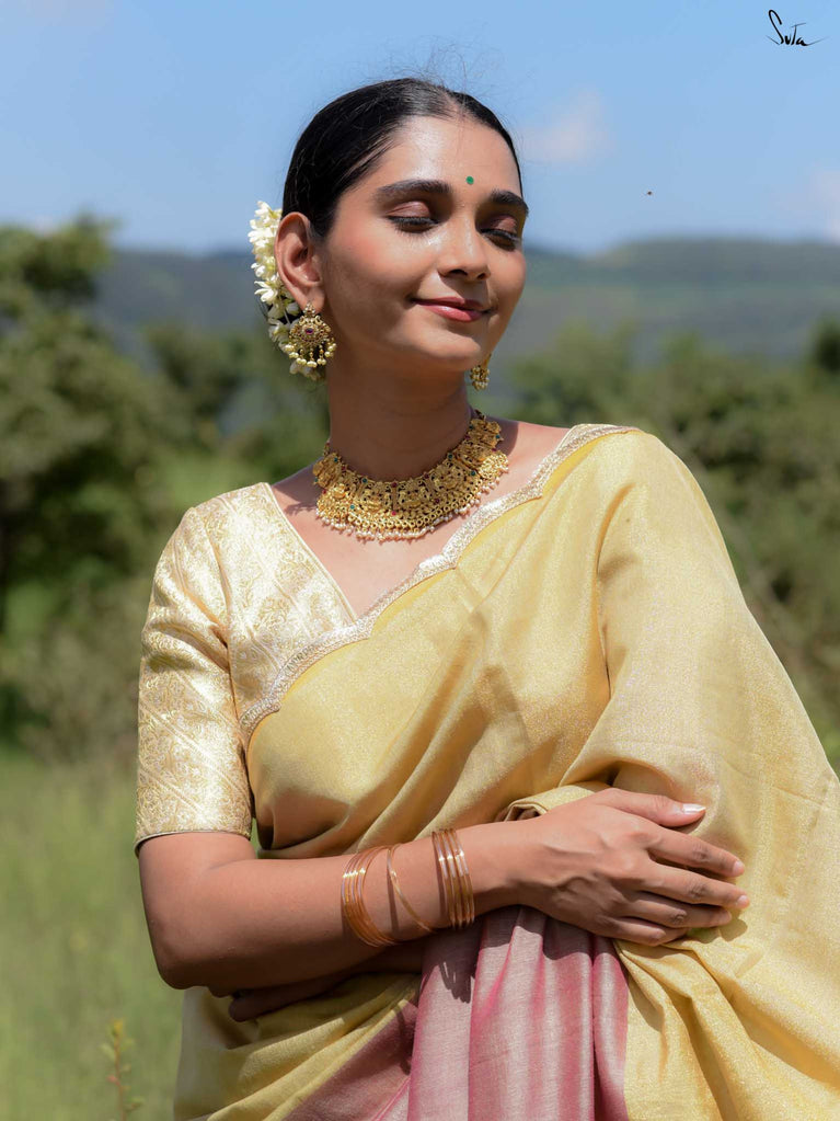 The model is wearing a size S blouse and the saree is Dipped in Pistachio.