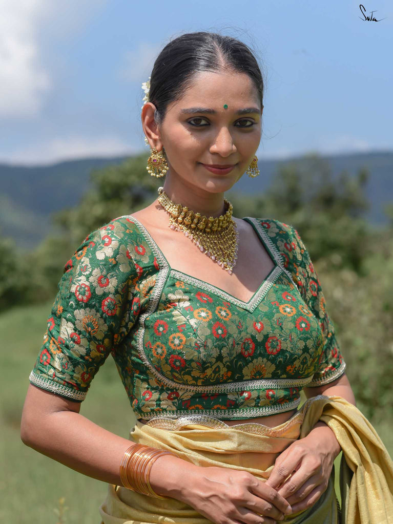 Traditional charm meets festive glamour in the Green Gold. Crafted from rich brocade fabric, this blouse features exquisite machine zari embroidery in intricate floral motifs. The elegant sweetheart neckline and half sleeves bring a timeless appeal, while the back-open hook closure ensures a comfortable and flattering fit. Perfect for pairing with silk or zari sarees, it’s an effortlessly regal choice for weddings and festive celebrations.