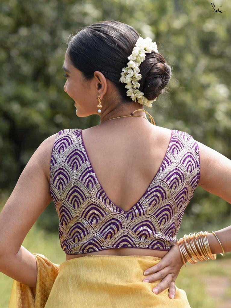 A little shimmer, a little sass, Uski Chaandi is all heart. This purple linen blouse is a playful take on timeless elegance, featuring delicate machine embroidery that glows like starlight. The V neckline and sleeveless cut lend it a modern, flattering silhouette, perfect for drapes that call for a hint of bold charm. It’s that one blouse you’ll reach for again and again when grace needs just a touch of mischief.