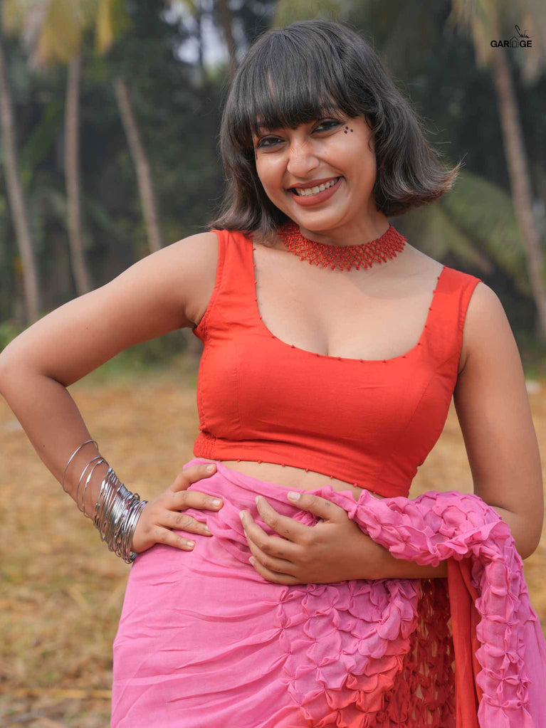 The model is wearing a size S blouse and the saree is Dipped in Gulaab.