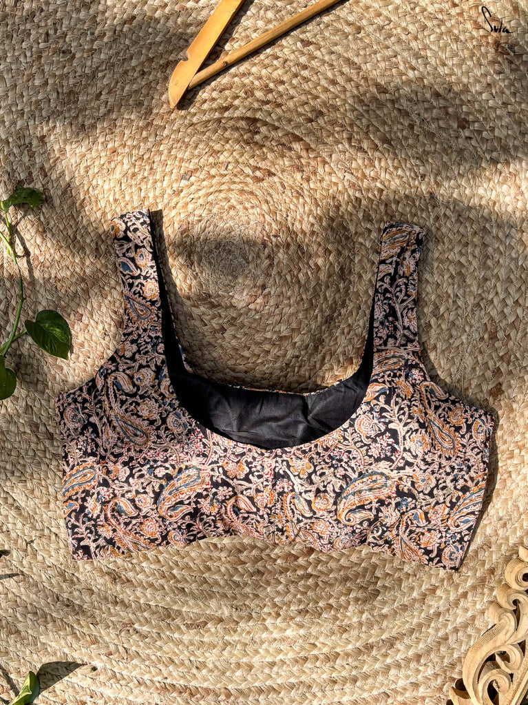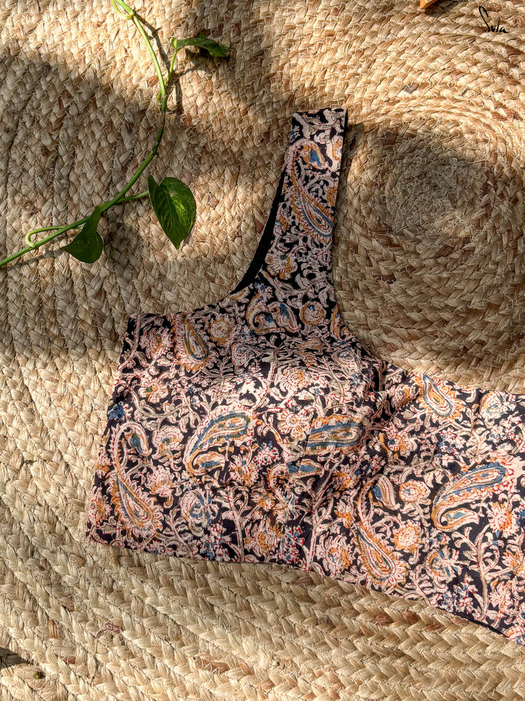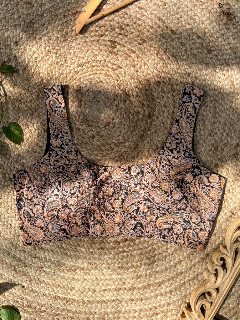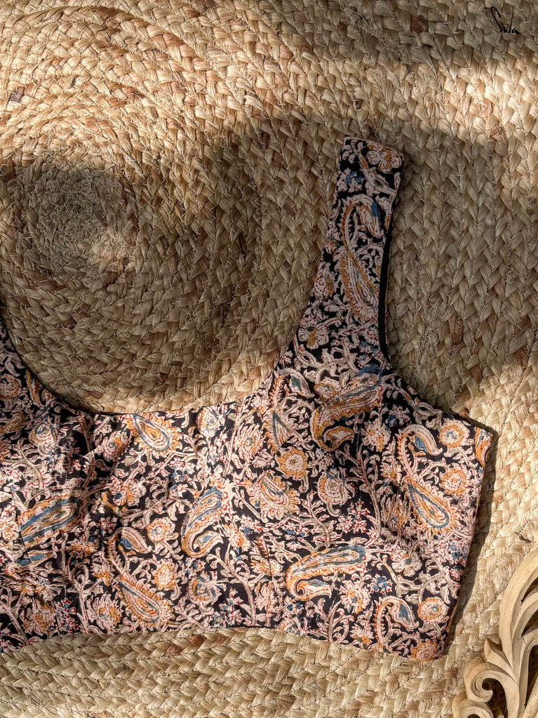 This pink floral cotton blouse hugs you just right, with a sleeveless cut that lets your confidence shine. V-neckline frames you beautifully, while the back hook closure keeps it sleek and chic.