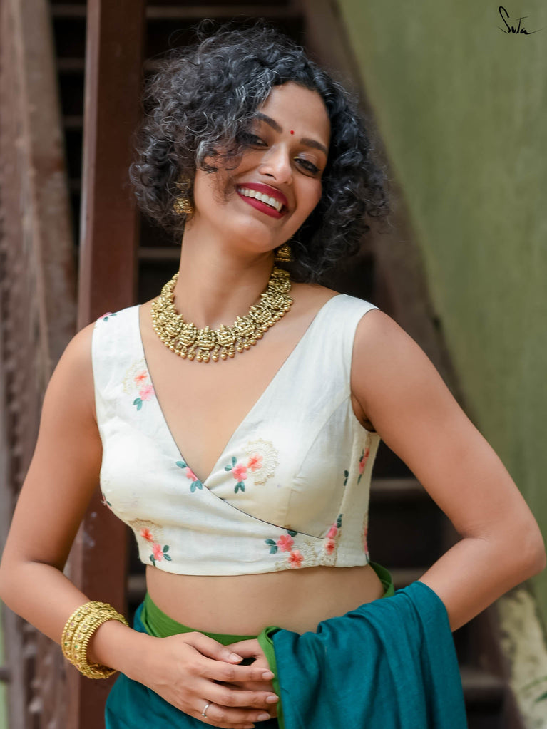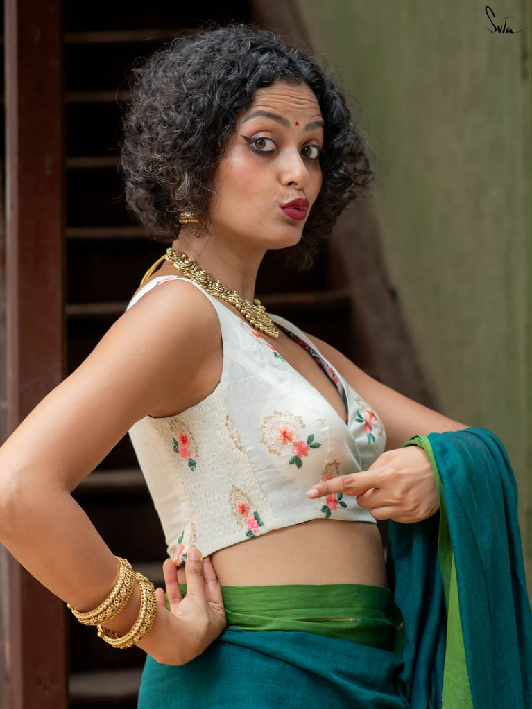 Su, the model is wearing sizes blouse and saree is Man Bhavra