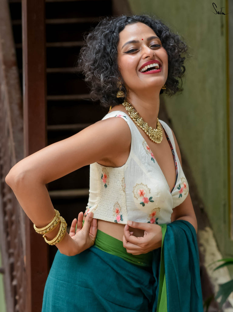 Su, the model is wearing size S blouse and the saree is Fireflies in the Garden Polka.