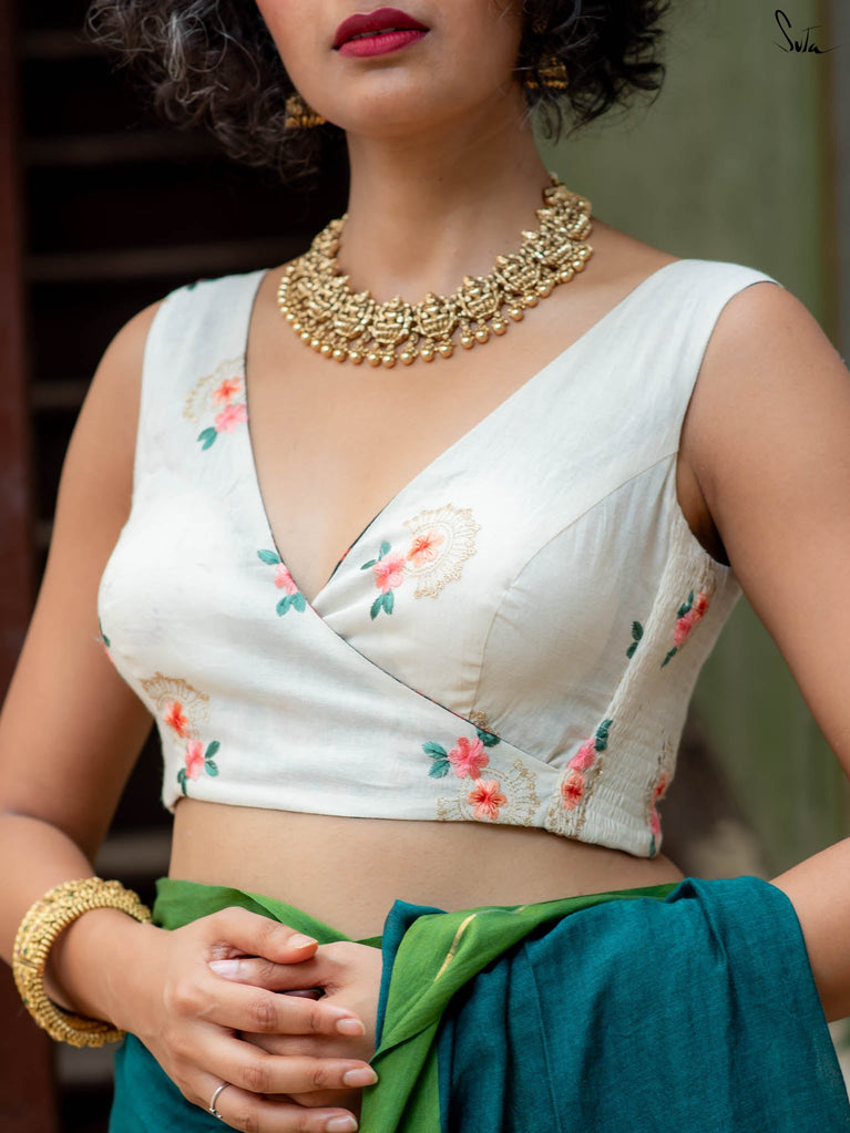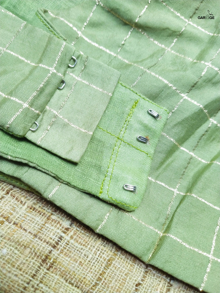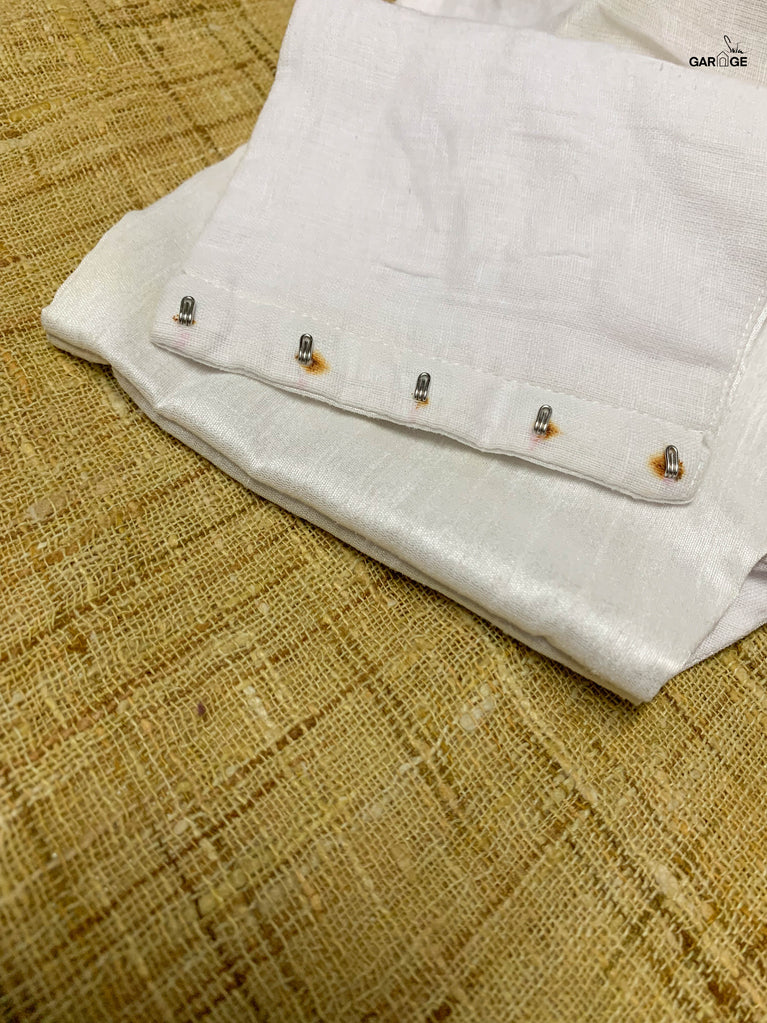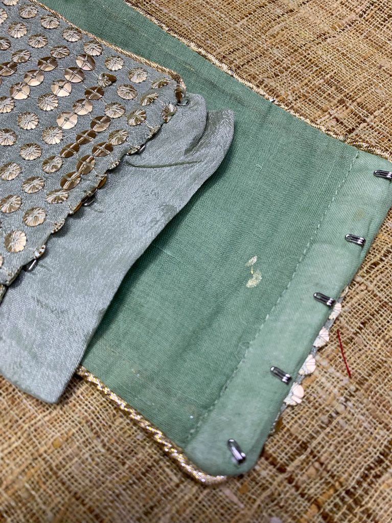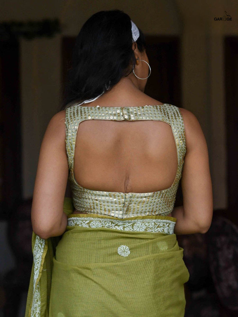 Polyester is a synthetically manufactured fabric that is known for its durability and a characteristic texture. The making of this blouse from fabric is an extensive process where our karigars and tailors come together. First, the master tailor makes a pattern on a brown paper for each size. Our karigars then trace this pattern onto the netted fabric of the blouse. This is then secured to a wooden frame for the hand embroidery to be done. Once this is done, the glitter is pasted onto the design and left to dry. When the fabric is finally ready, it goes to the tailors for the final cutting and sewing. And then behold! the magic of the blouse comes alive!