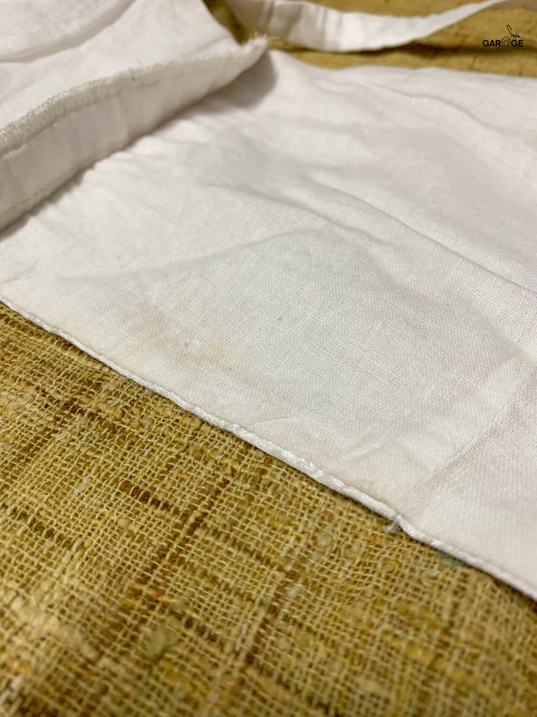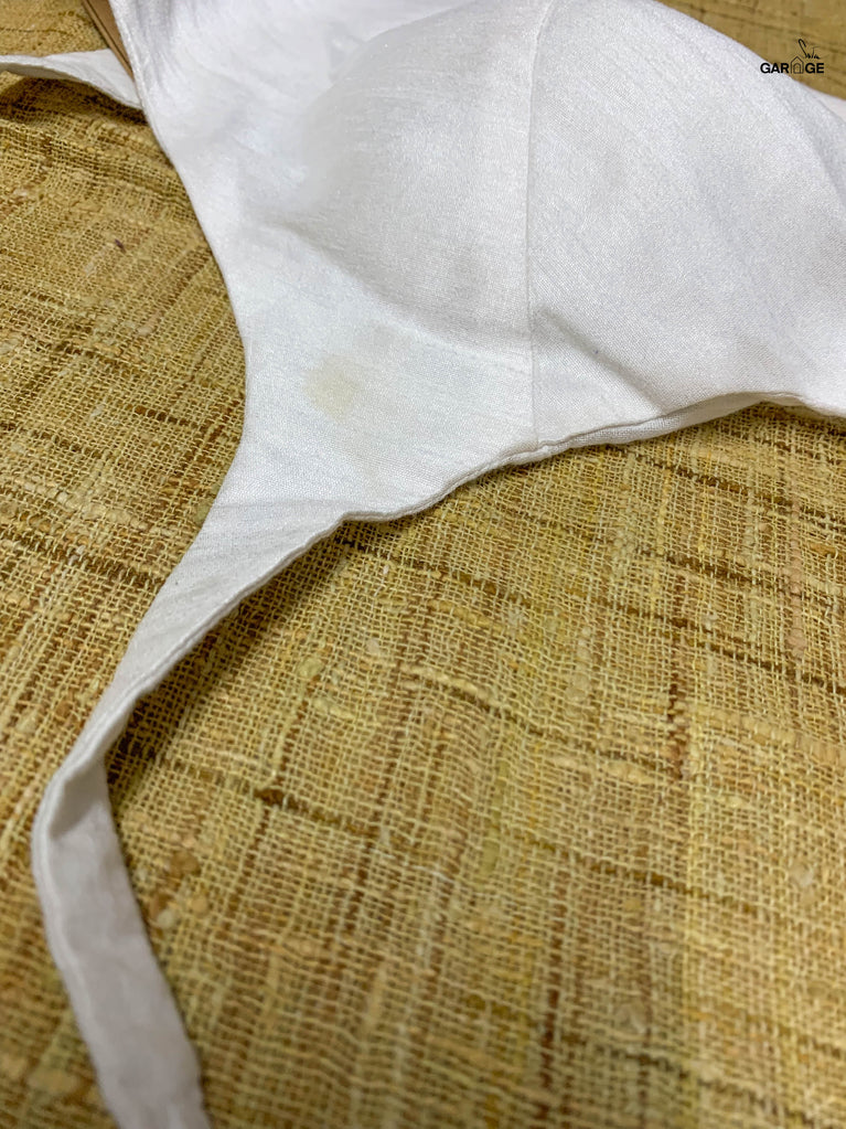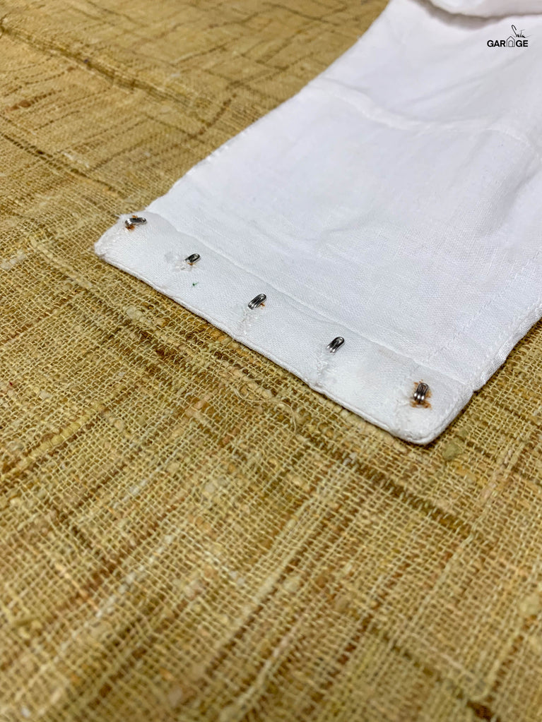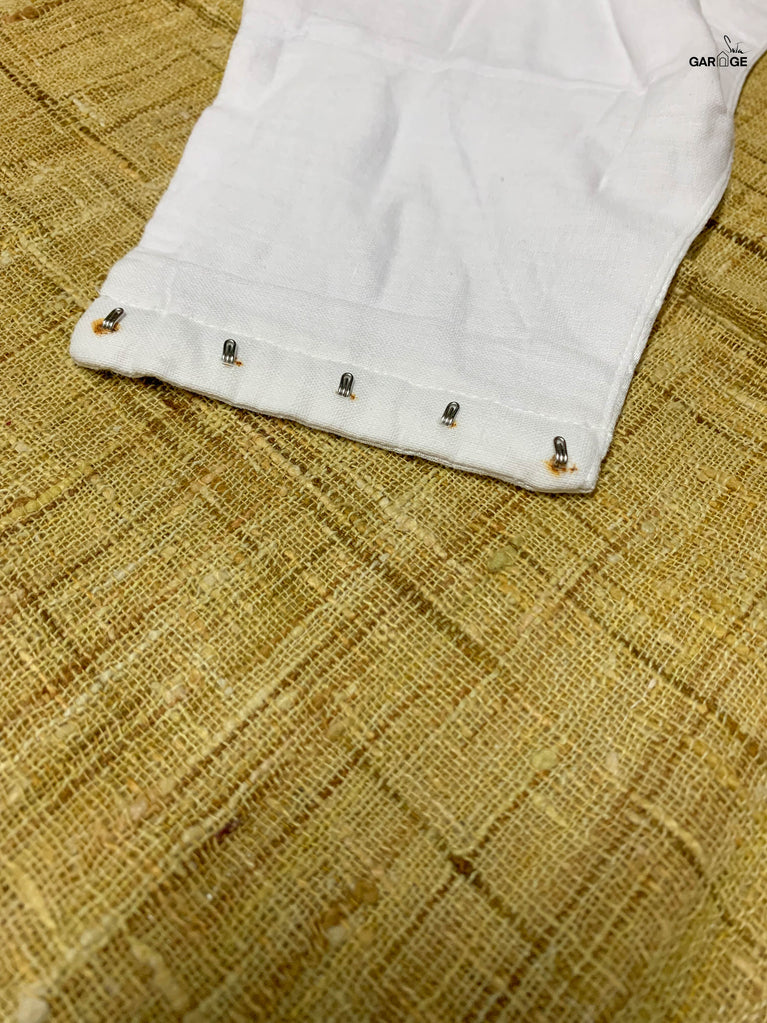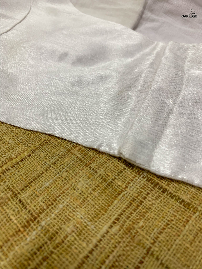 Polyester is a synthetically manufactured fabric that is known for its durability and a characteristic texture. The making of this blouse from fabric is an extensive process where our karigars and tailors come together. First, the master tailor makes a pattern on a brown paper for each size. Our karigars then trace this pattern onto the netted fabric of the blouse. This is then secured to a wooden frame for the hand embroidery to be done. Once this is done, the glitter is pasted onto the design and left to dry. When the fabric is finally ready, it goes to the tailors for the final cutting and sewing. And then behold! the magic of the blouse comes alive!