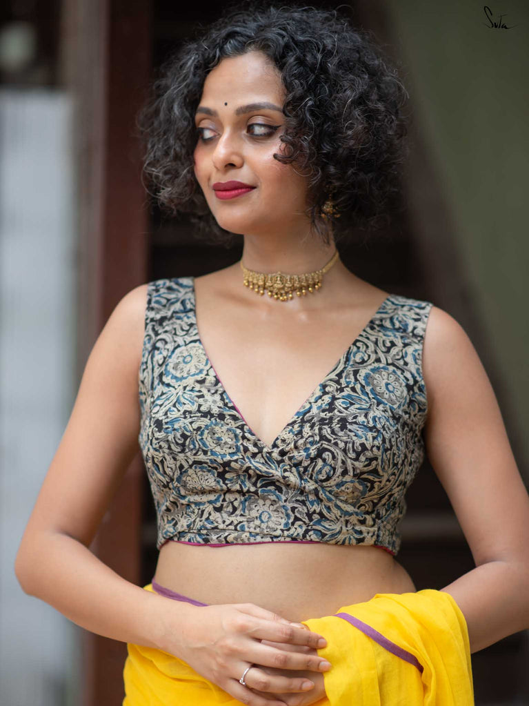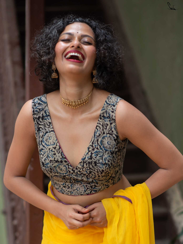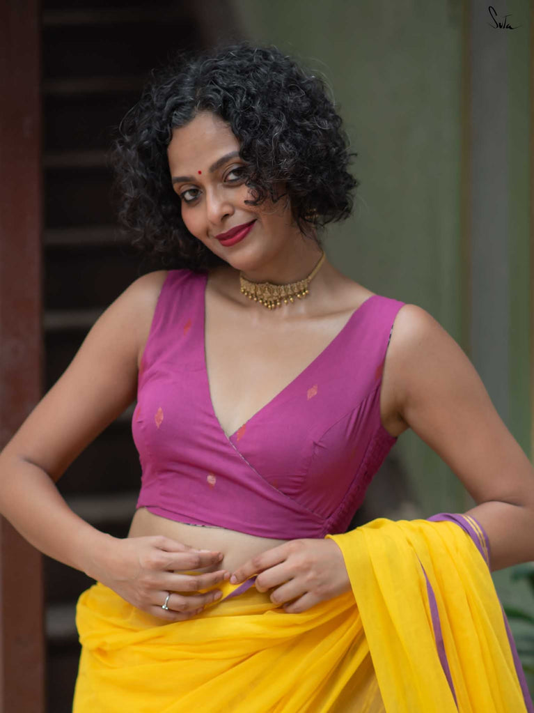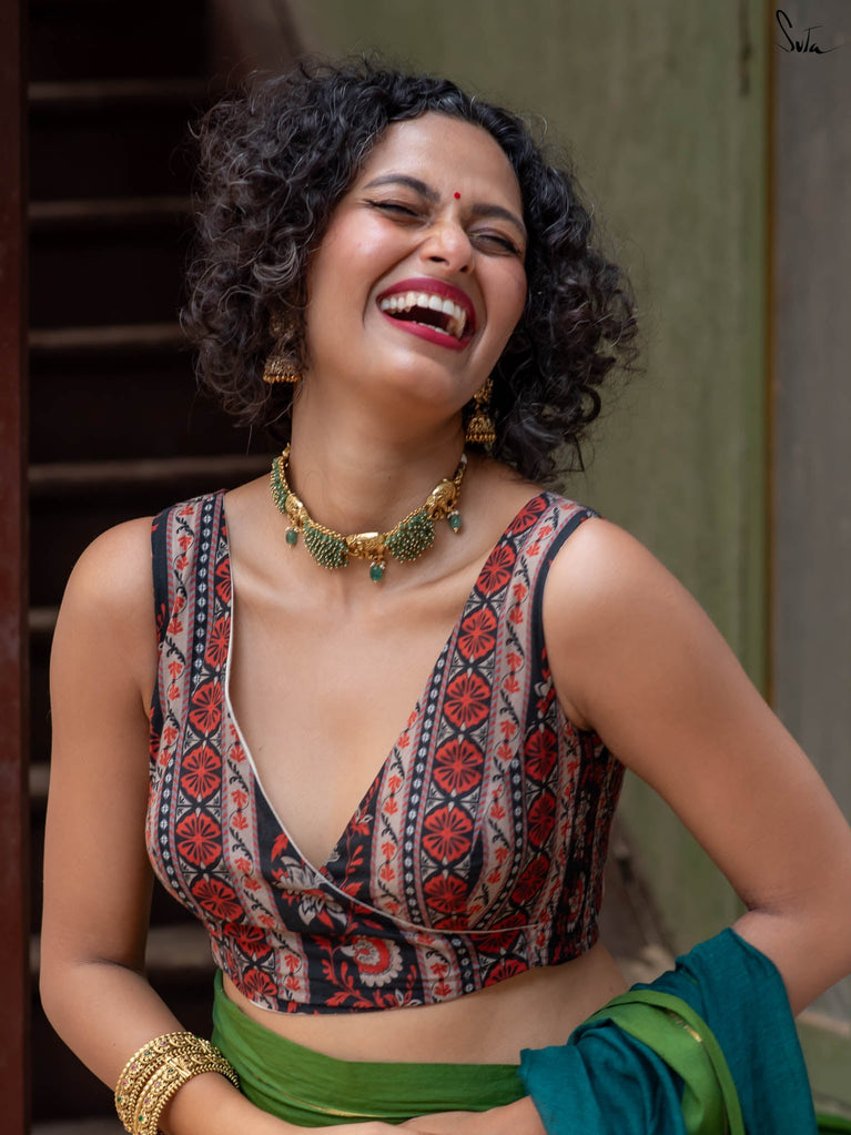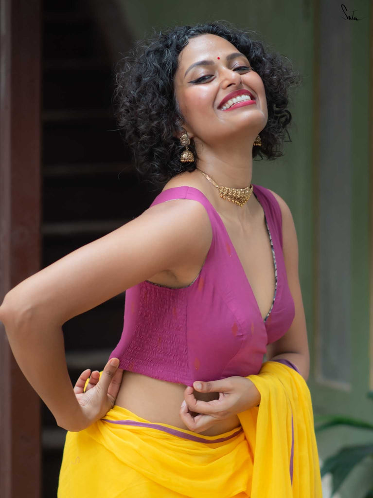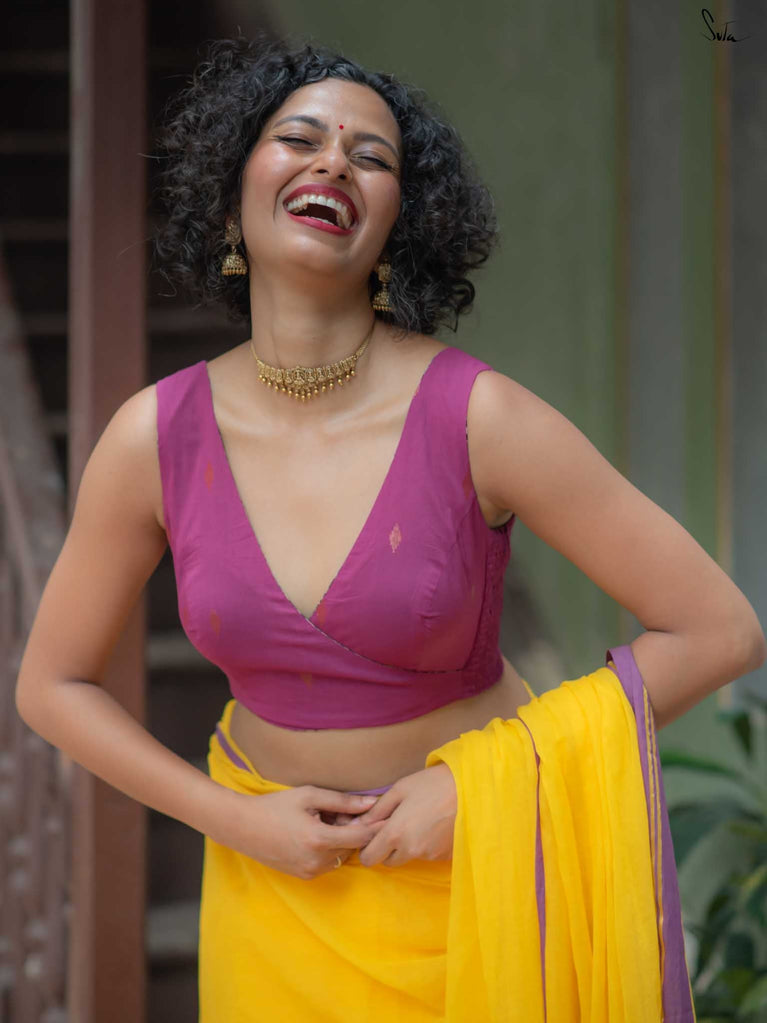 With a punchy black and pink combo, Alat Palat Jamun crafted for your every mood, from boldness to laziness. Sleeveless and elastic-fitted, it features a flattering V-neck front ideal for summer sarees and power-drape moments.