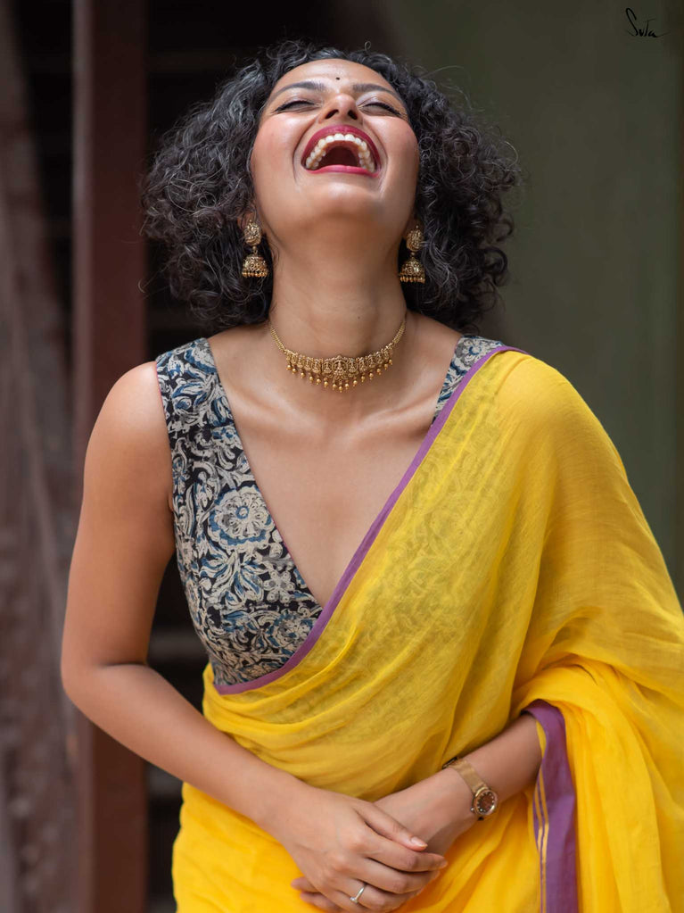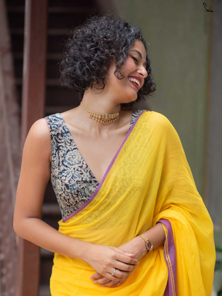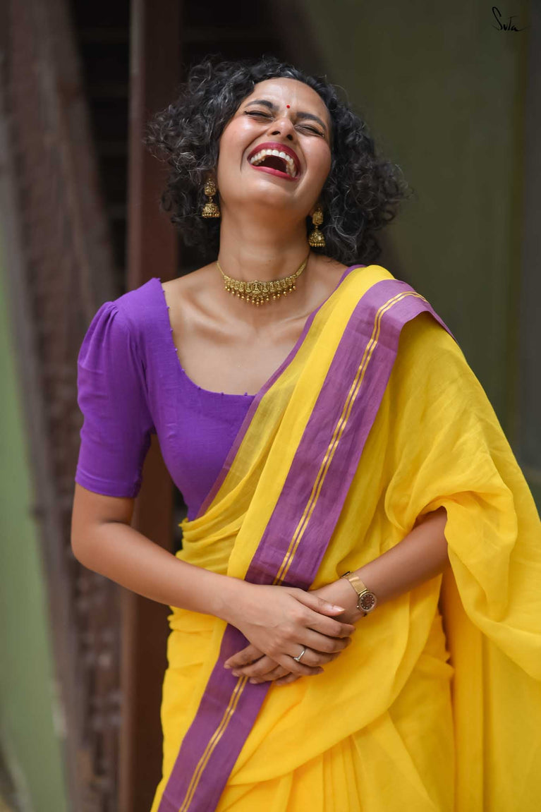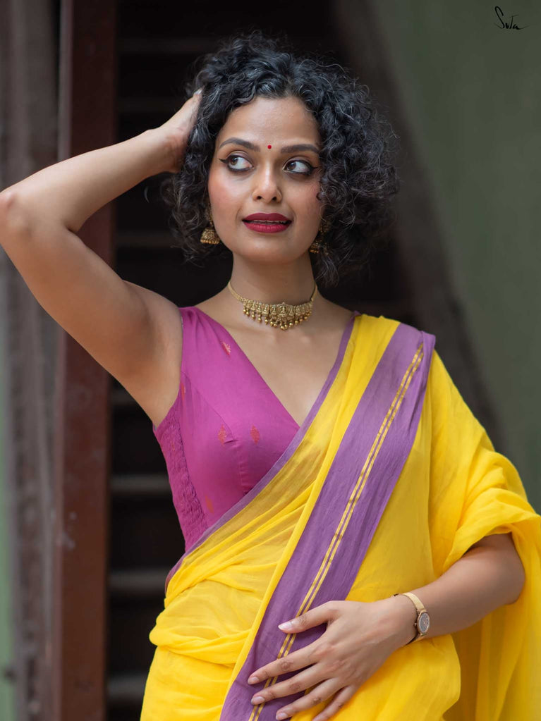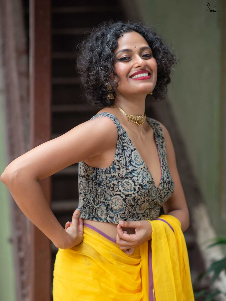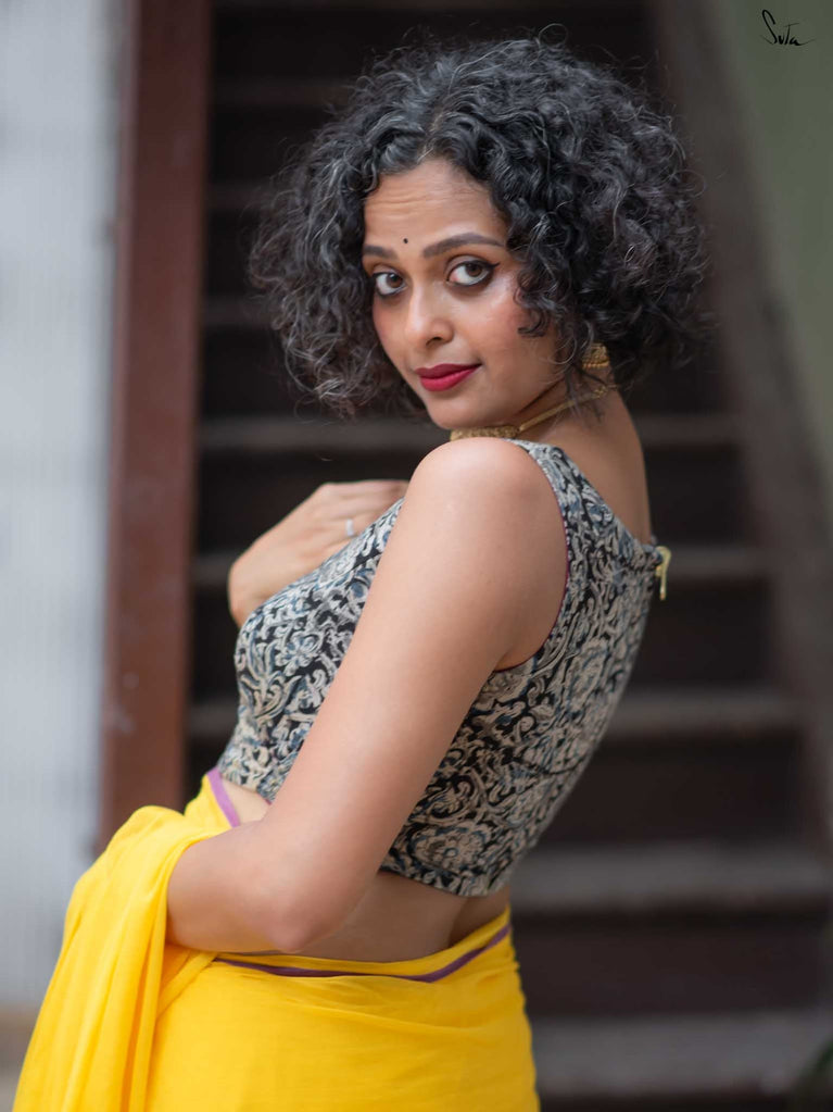 The model is wearing size S blouse and the saree is Haldi hustle