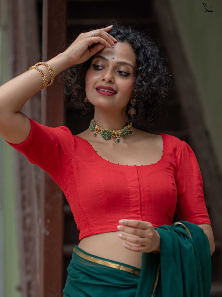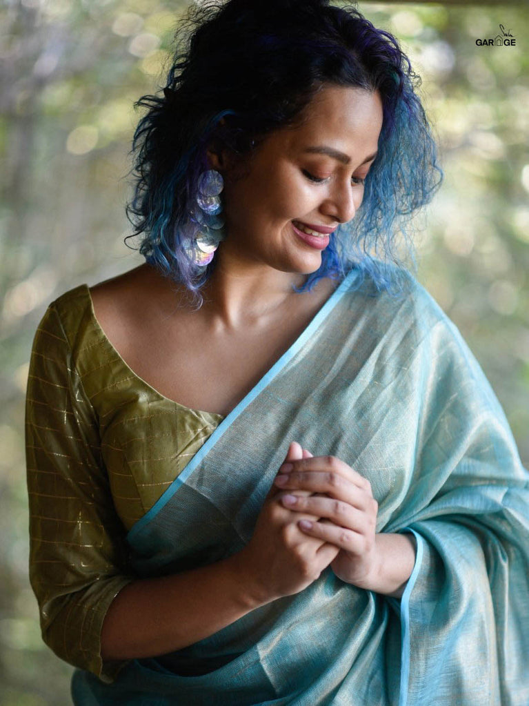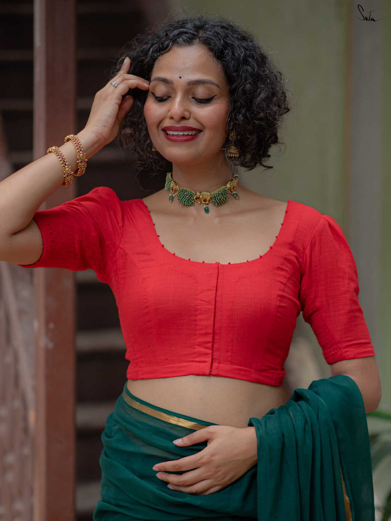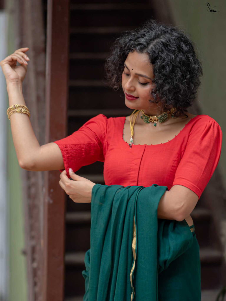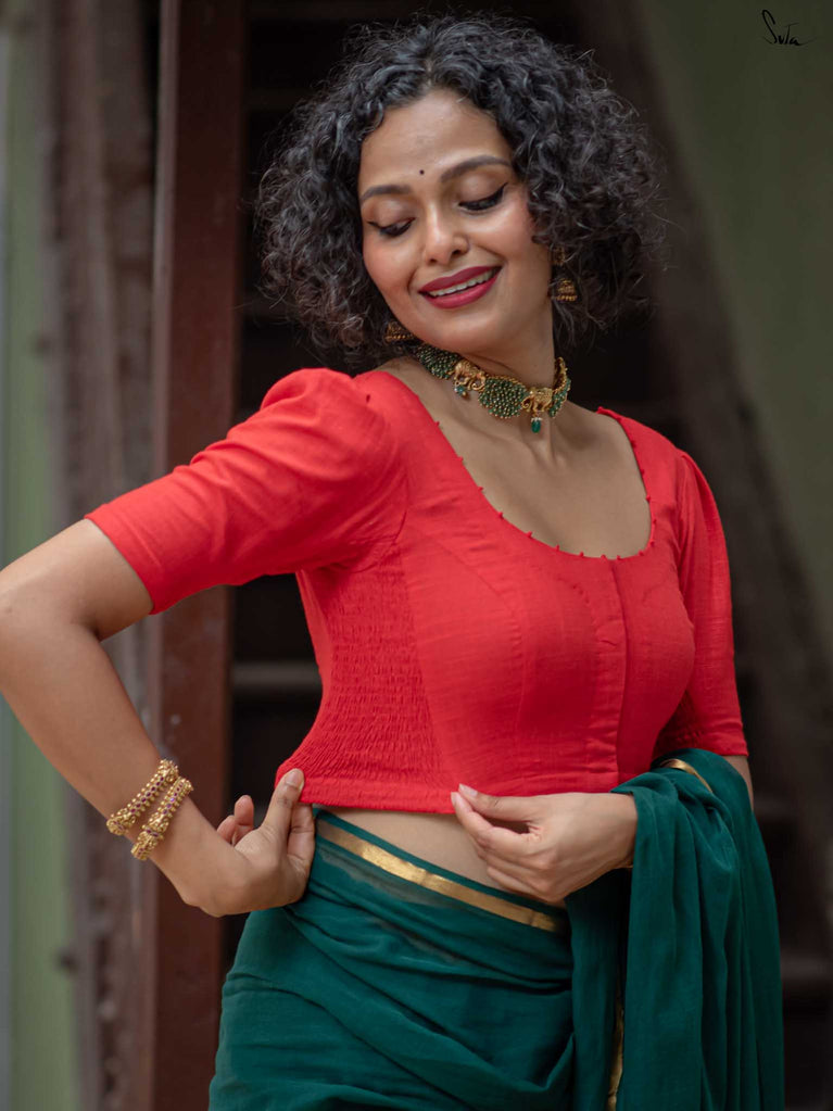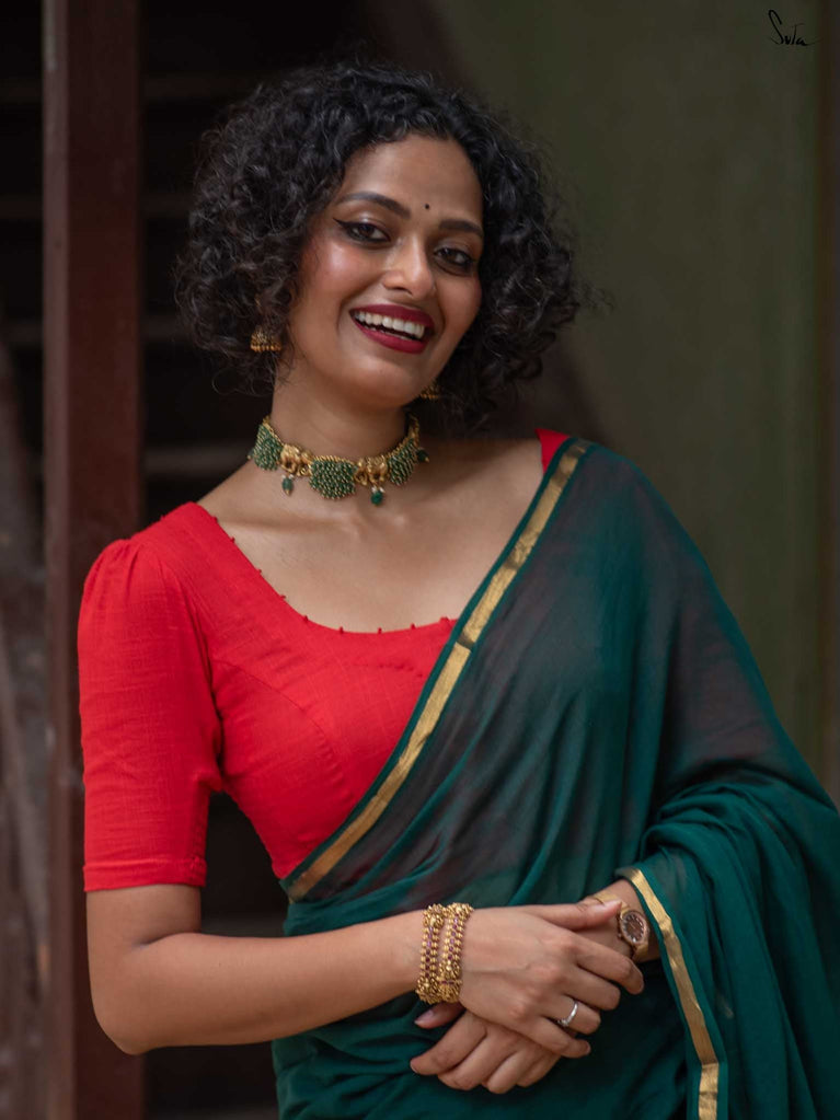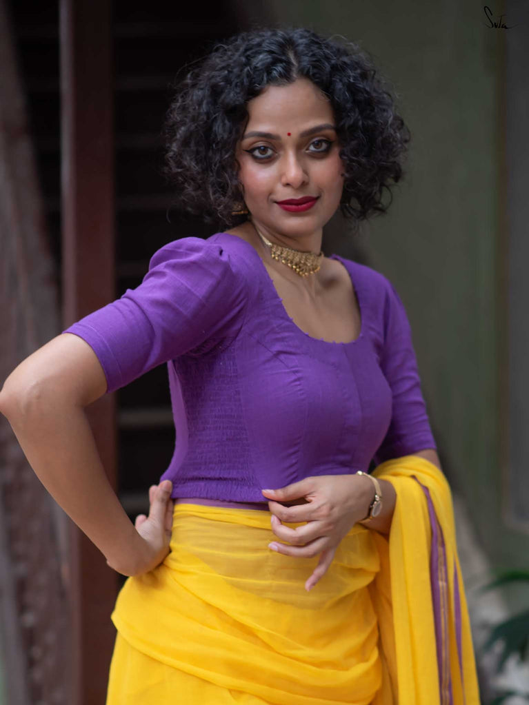 The model is wearing size S blouse and the saree is Kochu Pata