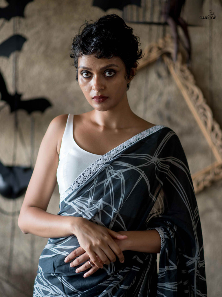 Su, the model is wearing size S blouse and the saree is Floating Stars in the Galaxy Polka.