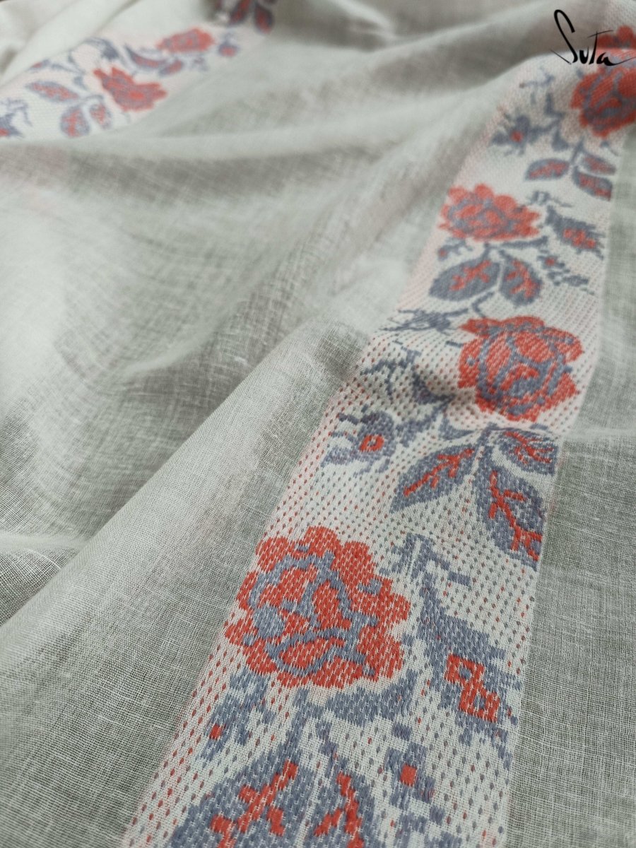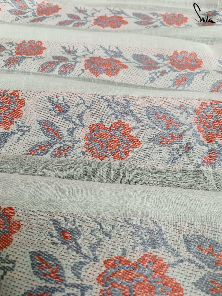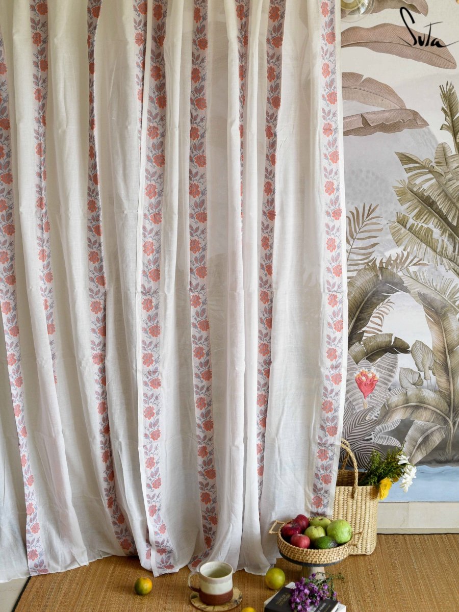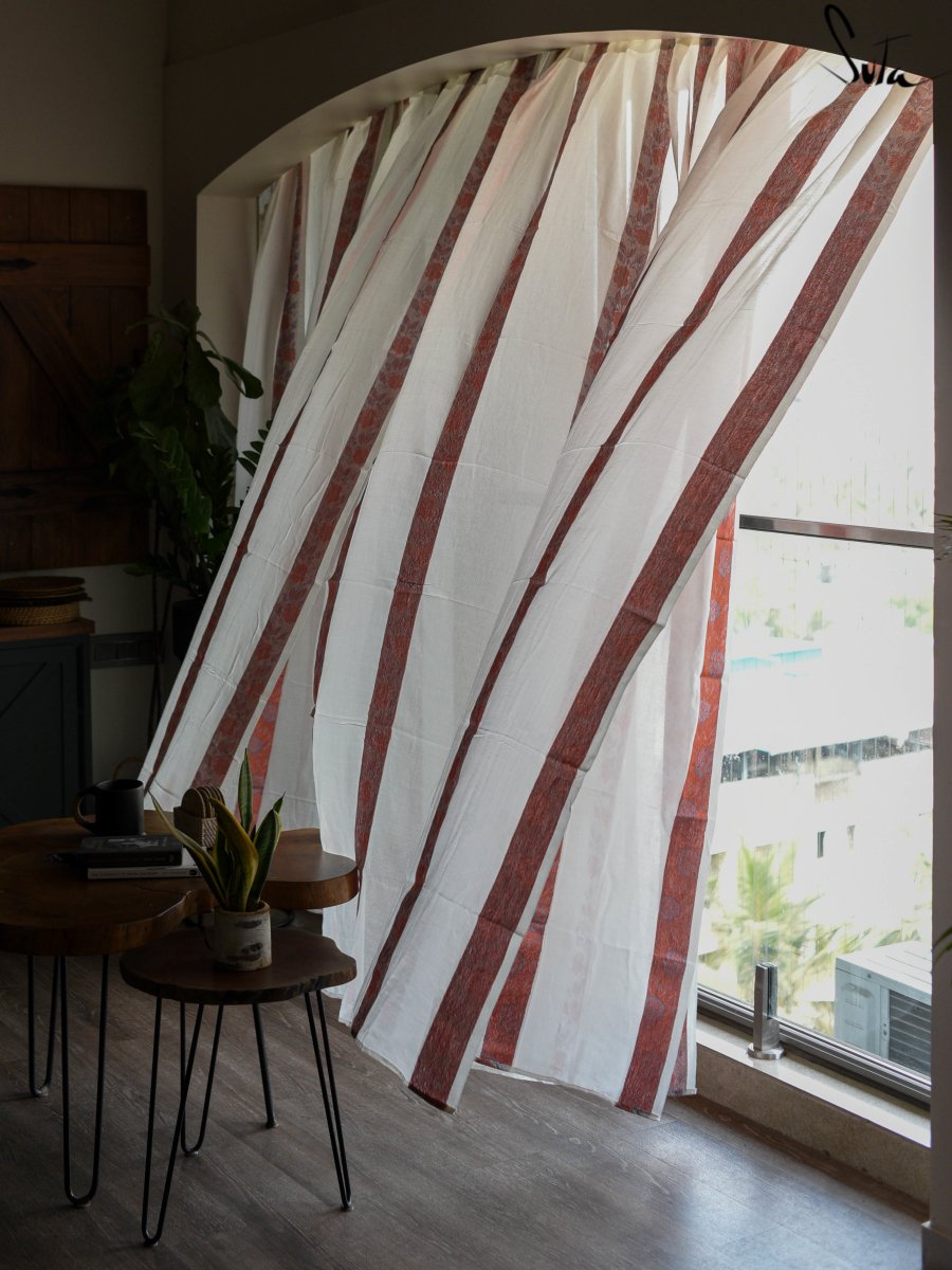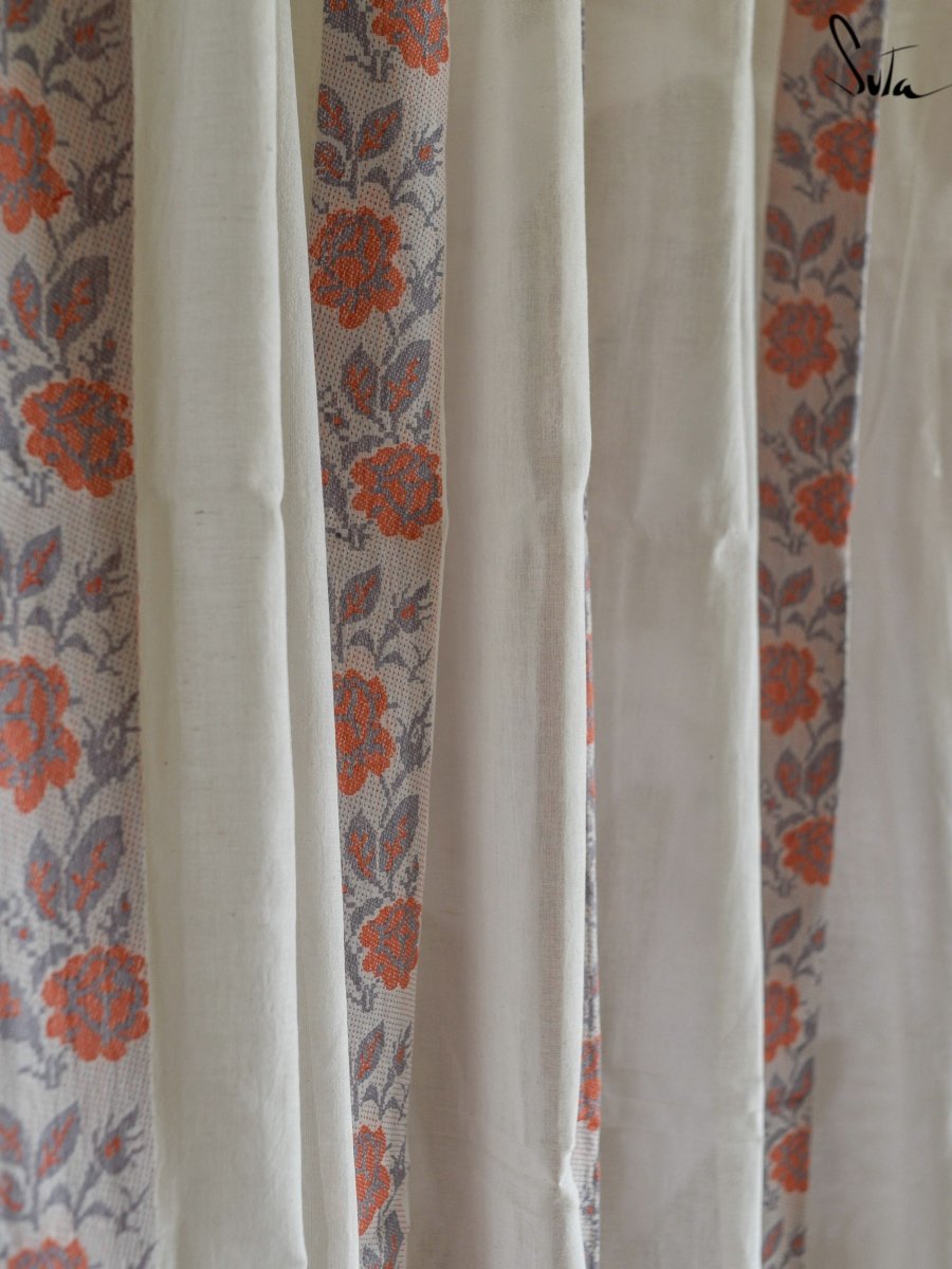 Suta’s signature ‘made in heaven’ mul cotton, is also known as mul mul in West Bengal. The fabric is buttery soft and has a delicate beauty. Its weave is very fine and this lends a very fluid texture to the fabric. These curtains also feature woven floral motifs to add an air of sophistication to the fabric.