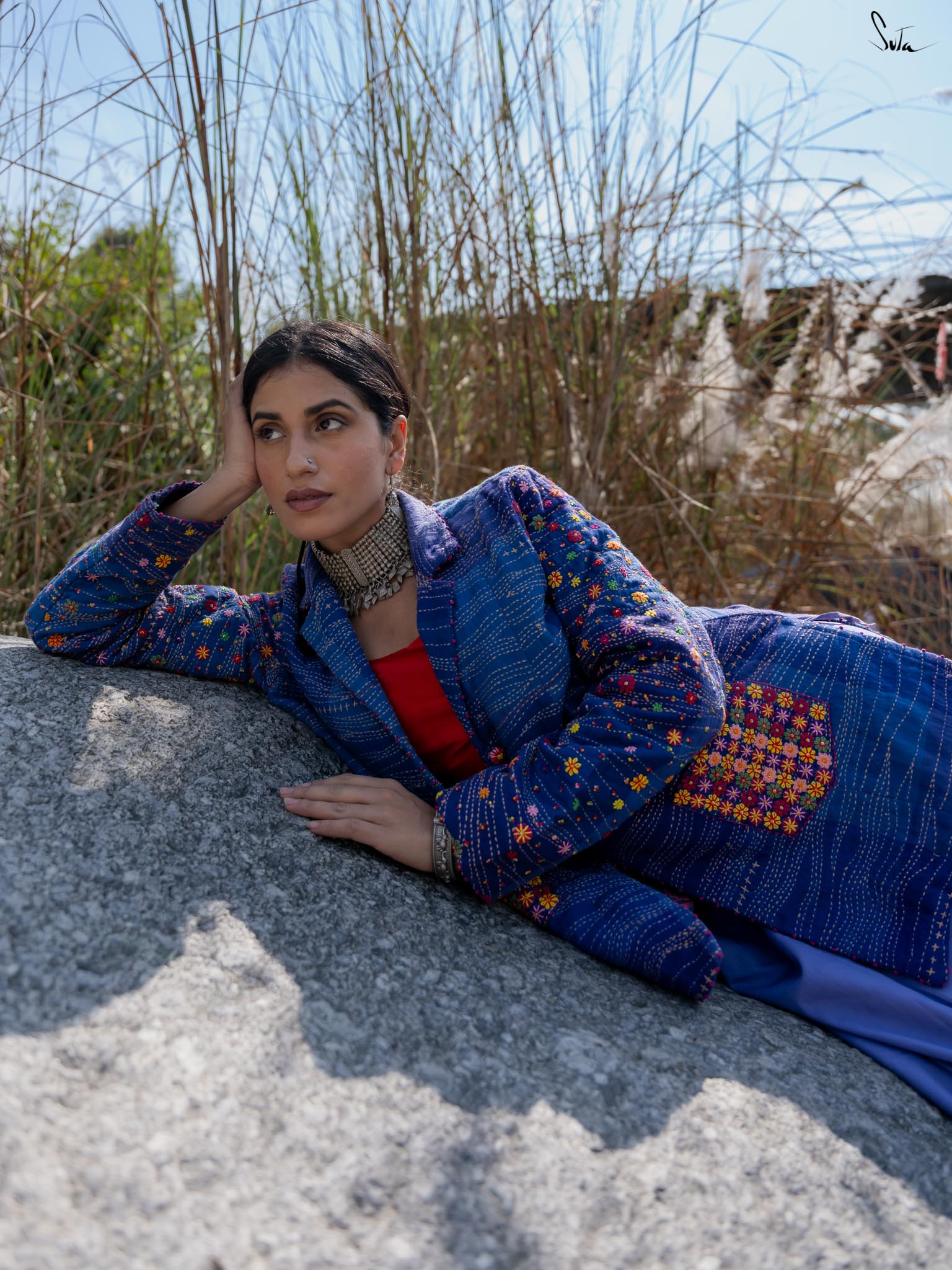 Inspired by the tranquil coastal town of Bardez, this jacket from Suta’s Bageecha collection tells a story of serene blues and vibrant florals. The deep shades of blue, quilted with traditional Katha running stitches, carry the stories of skilled hands passing from one artisan to another. The multicolor floral embroidery on the pockets and sleeves, meticulously hand-stitched, showcases the artistry of our craftsmen who infuse each design with their heart and soul. The pink French knots at the jacket and sleeve hems are a delicate finishing touch, each knot a tiny act of love. The buttons, embroidered with flower motifs, further reflect the care that has gone into this jacket. This creation is more than just a garment; it’s a narrative of tradition, artistry, and the love of our craftsmen that flows through each intricate detail.