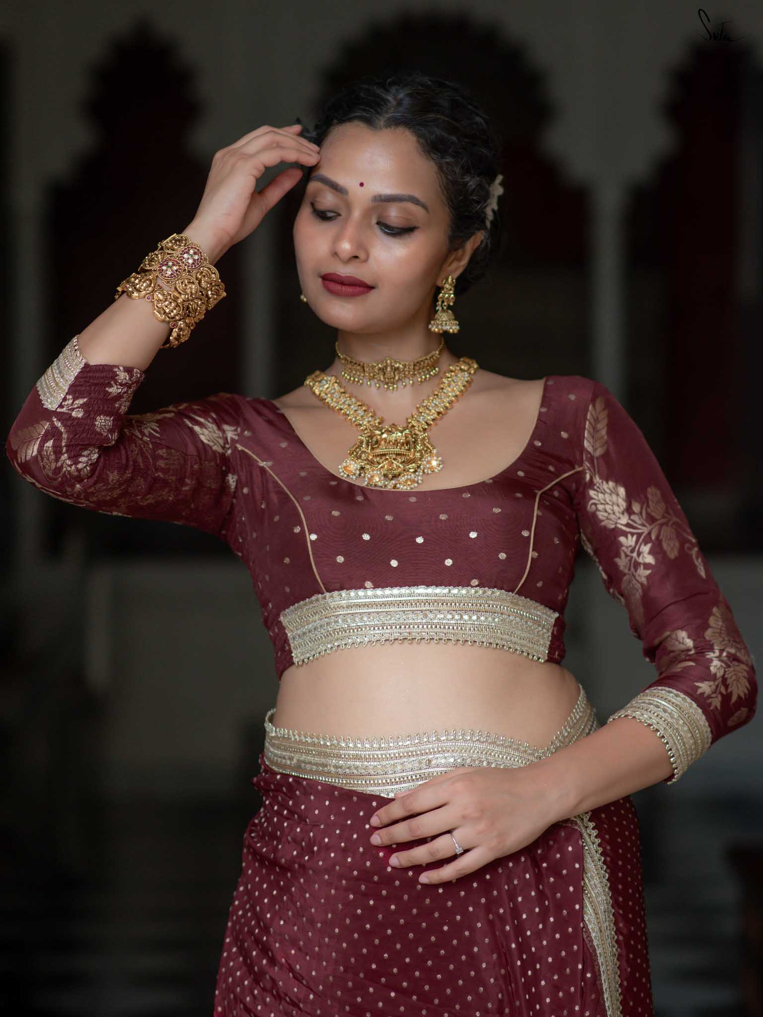 Rich in maroon and full of festive drama, Boondi Hai features a round neck, three-fourth sleeves, and embroidered lace on a woven polka and floral jaal base. The back round neck opening completes its classic look, making it a versatile choice for wedding sarees.