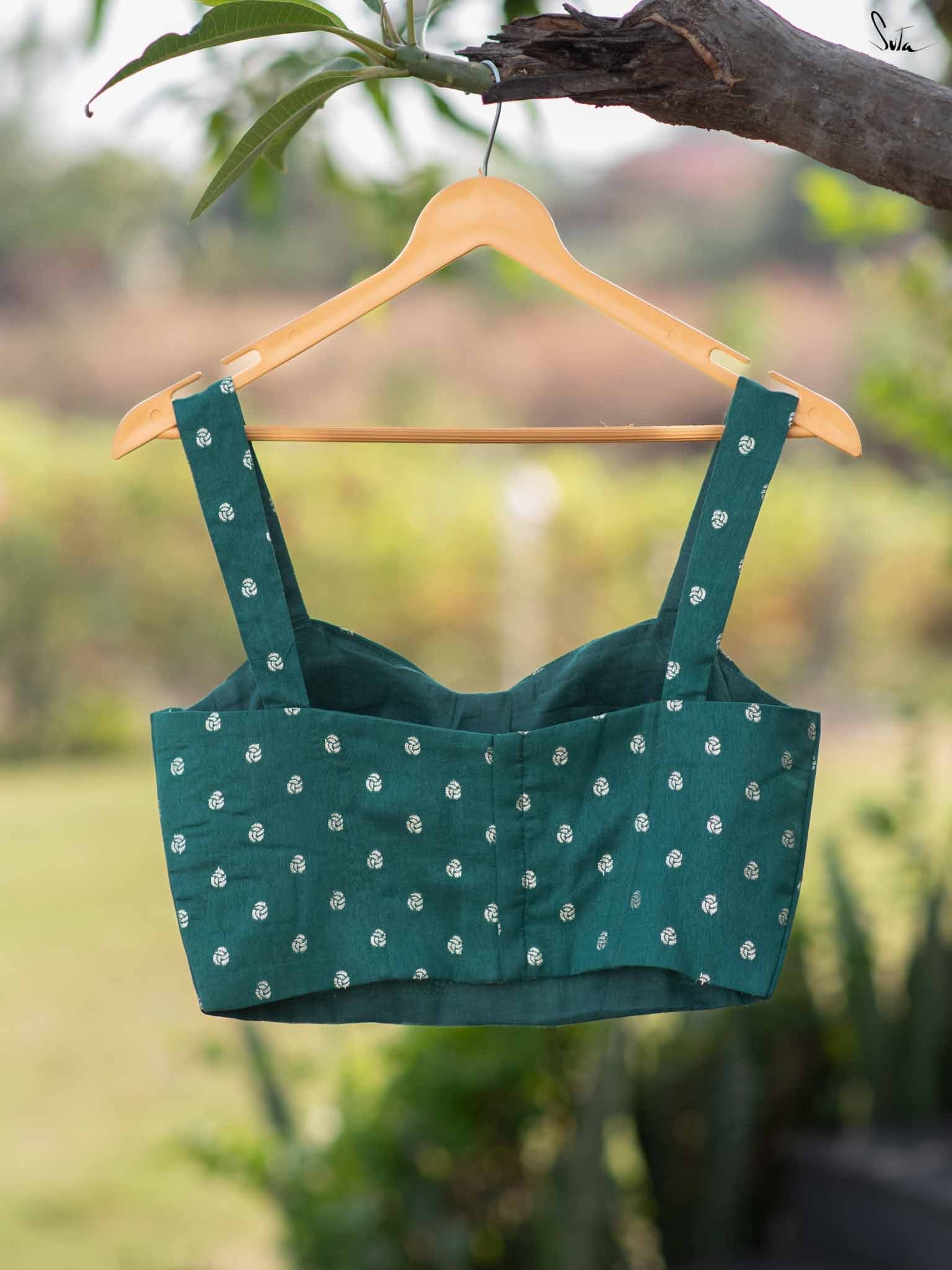 Chandra Rekha, a lightweight green brocade blouse, features a bold sleeveless design and a back hook closure. Its vibrant color and modern silhouette make it a favorite for any saree lover.