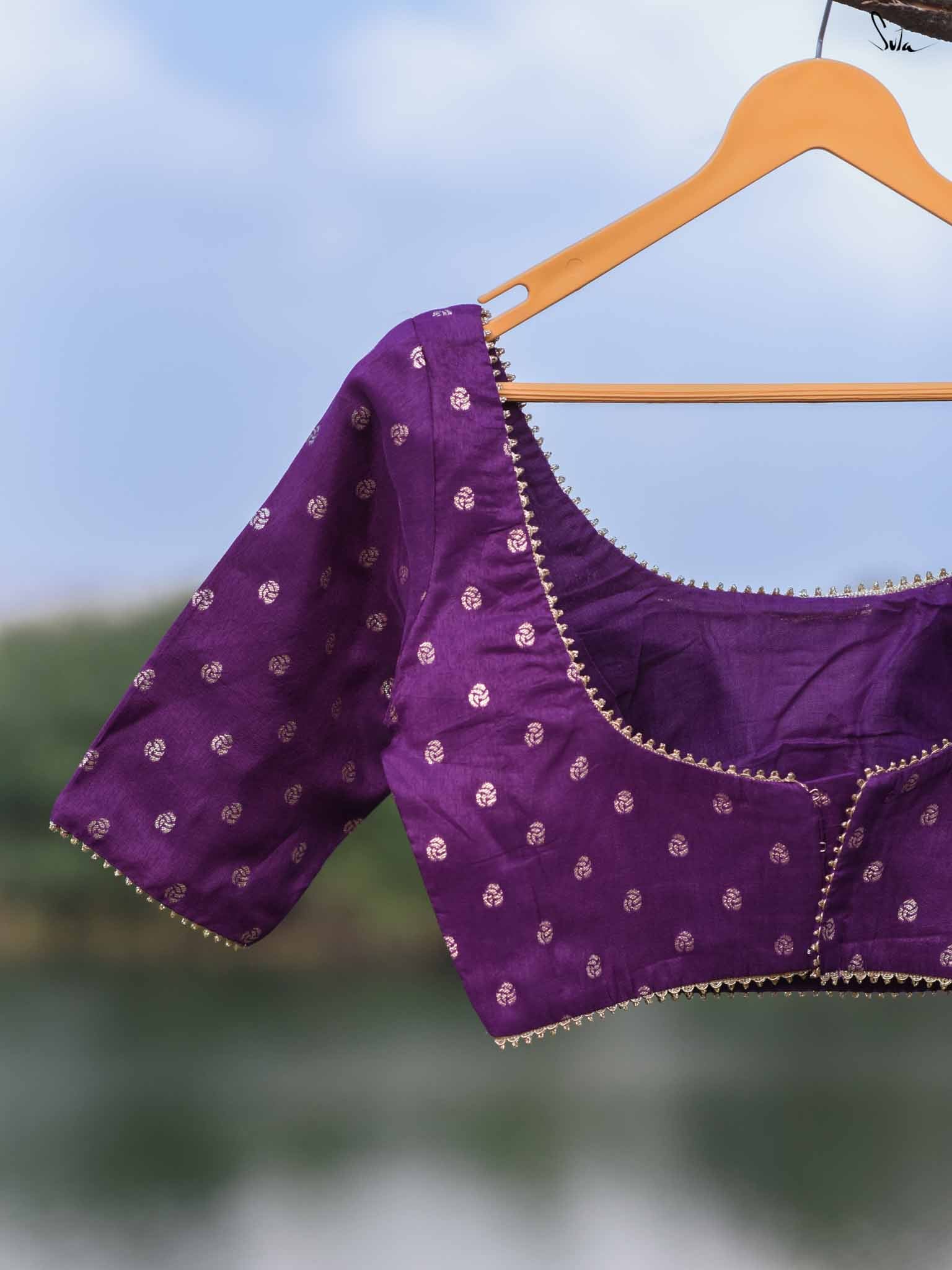 This vibrant purple brocade blouse, Chiuli Vasant, is made from a lightweight viscose blend. With its round neckline and elbow-length sleeves, it adds a lively energy to any outfit.