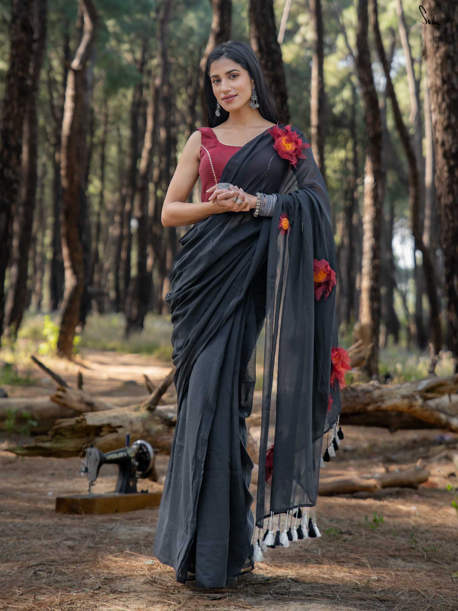 This saree is timeless elegance with a blooming twist. The soft black mul cotton drapes like a dream - lightweight, breathable, and endlessly flattering, making it a perfect go-anywhere, glow-everywhere piece.