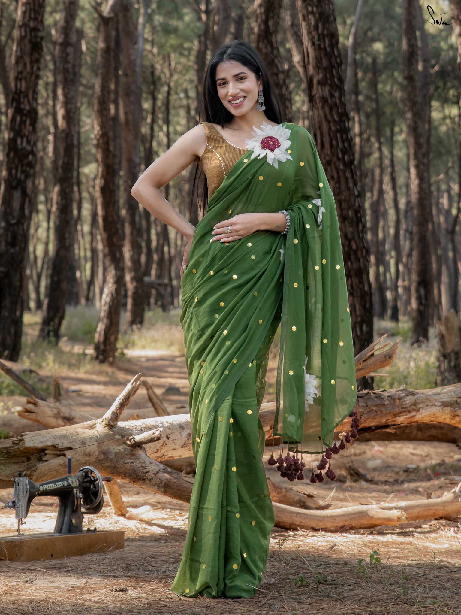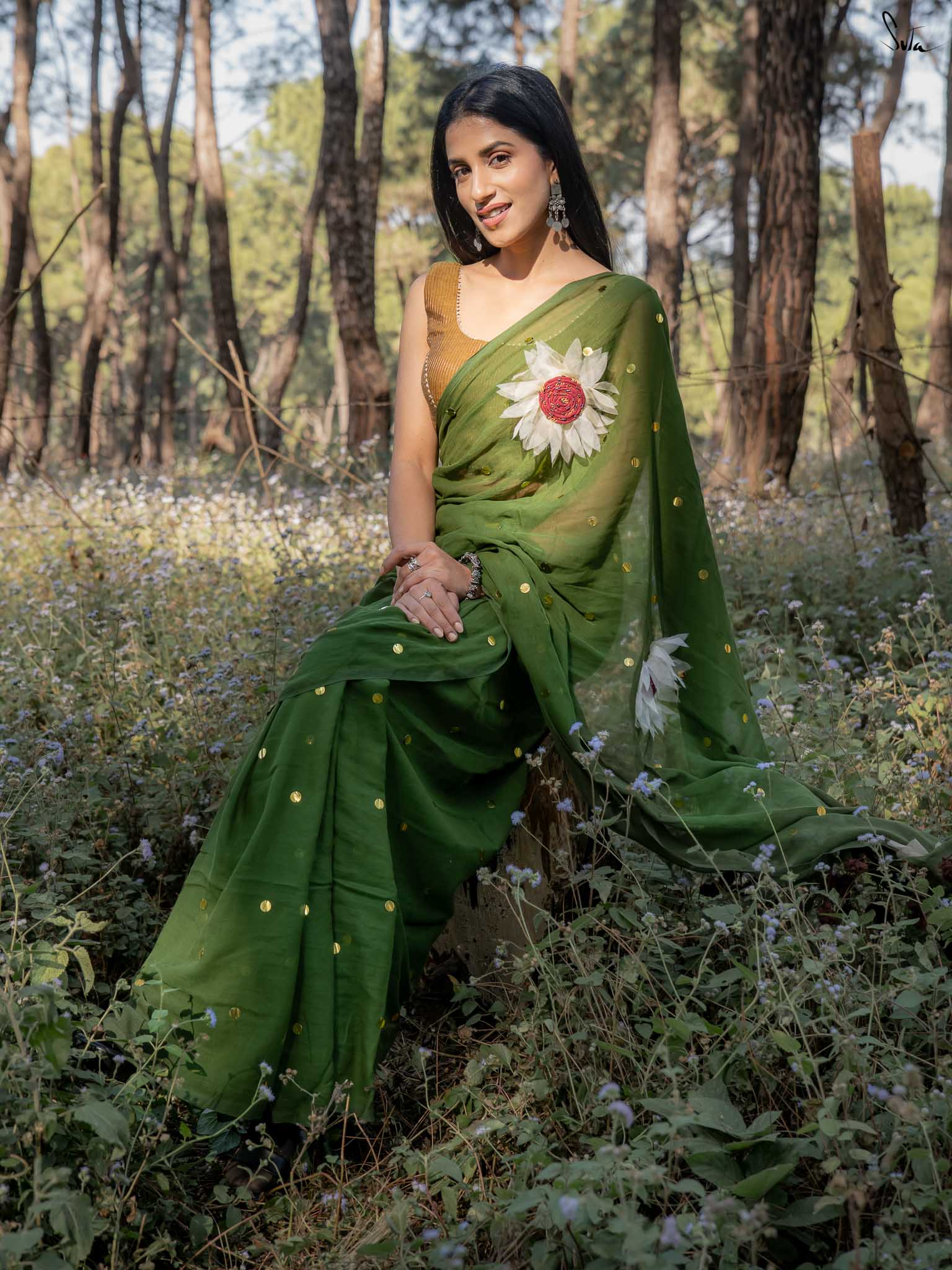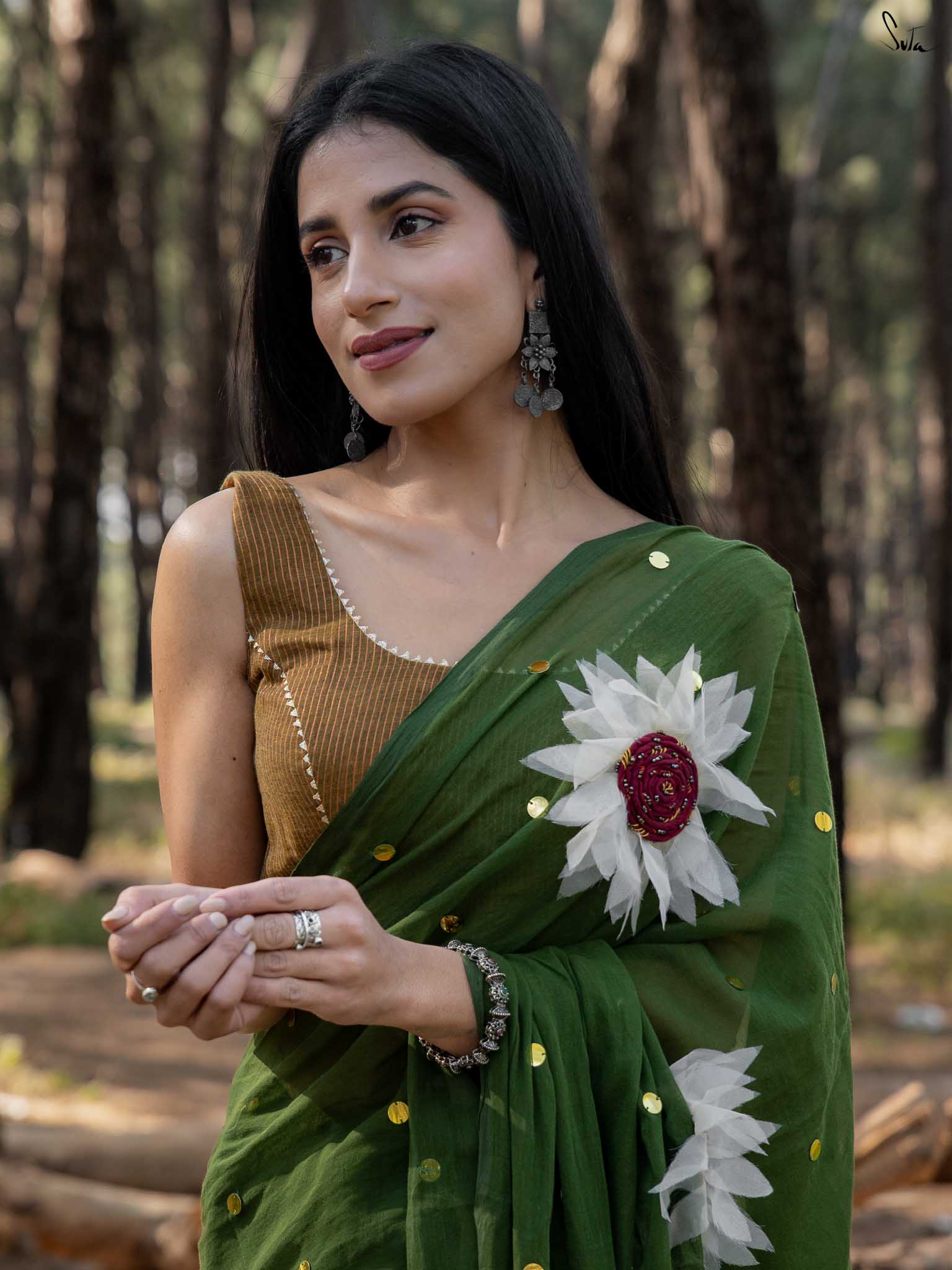 This saree brings together earthiness and bloom in the softest way. The olive mul cotton drapes like a gentle breeze - light, breathable, and naturally elegant, perfect for days when you want understated charm with a touch of artistry.