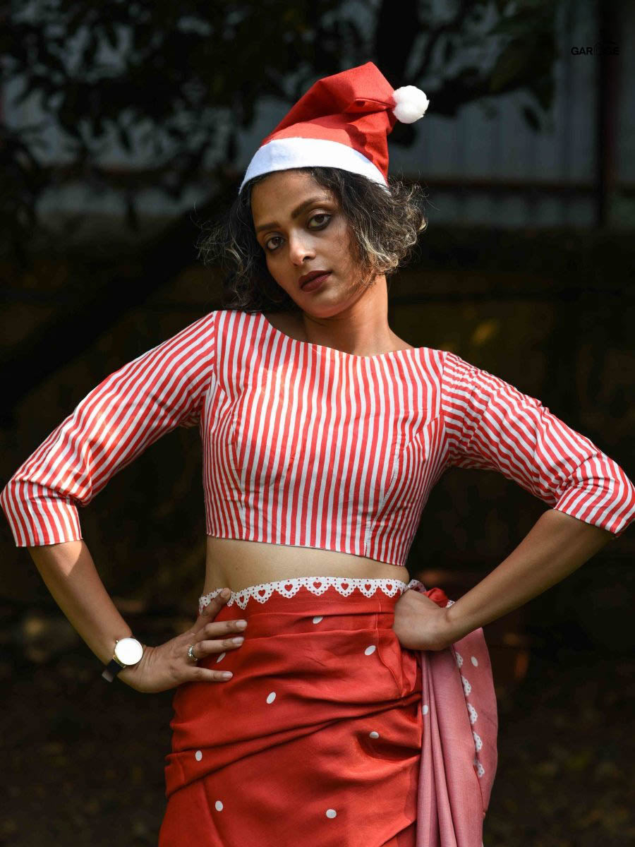 Su, the model is wearing sizes blouse and saree is Barfila Tyohaar